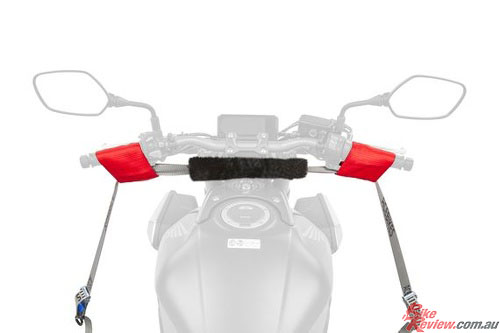 The Buckle-Up all-in-one handlebar tie-down solution from Ace Cycles comes with plasticised hooks with resilient locking clips for additional security. It is fitted with an integrated faux sheepskin sleeve to protect your motorcycle from scratches and damage.