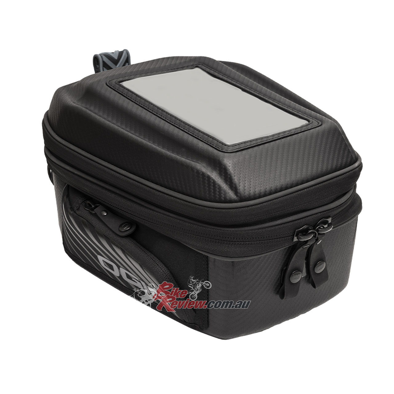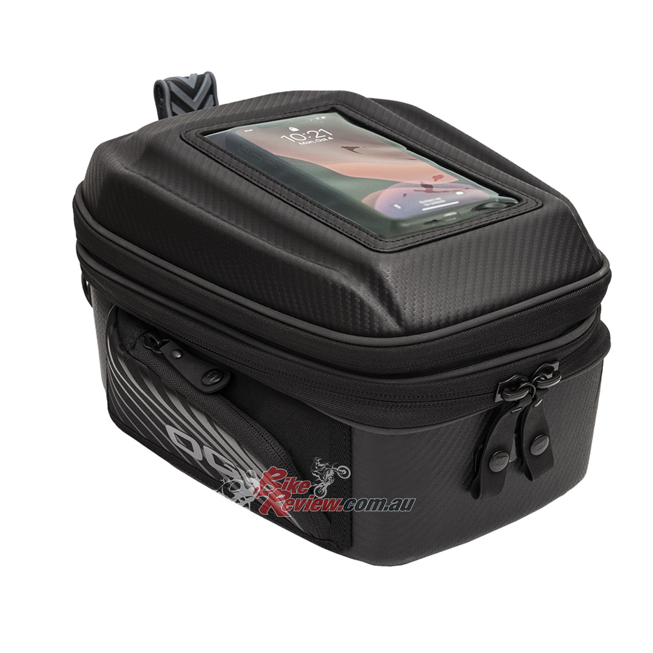 The M2 is an 8L tank bag with a 2.5″ expansion joint that allows the bag to expand and store up to 12L of volume. Made from single shot molded PU with Carbon Fiber graphics, this bag is water resistant, features a see-through phone window, power cord port, internal removable storage pouch and shoulder strap. Extremely versatile, this bag is both a daily and travel workhorse.