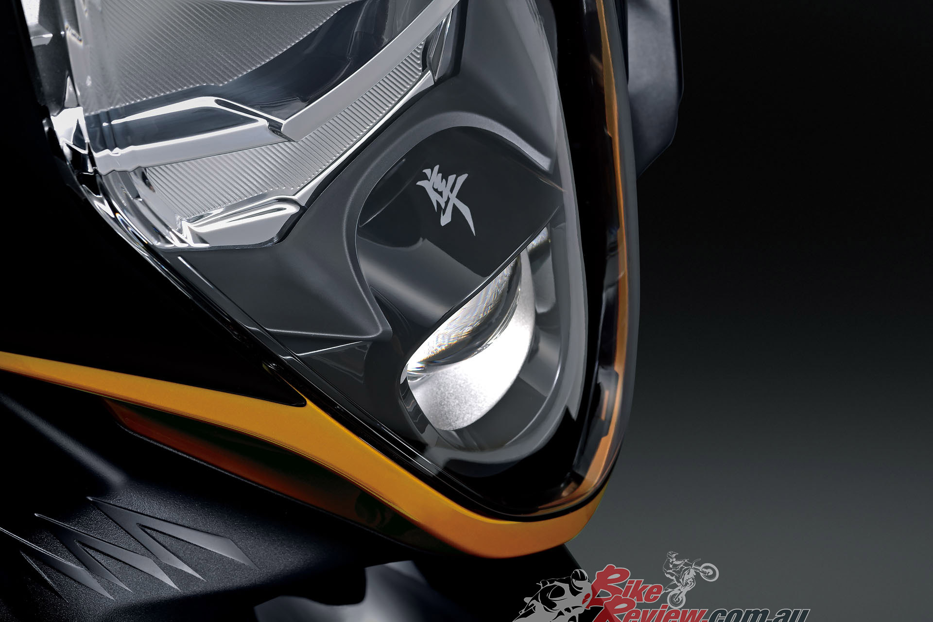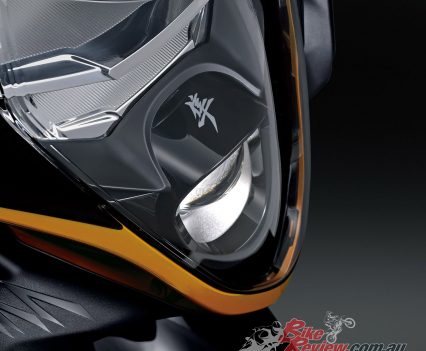 In addition to the bold character on the side of the cowling, smaller versions of the Japanese logo add highlights on the black shroud over the projector type high beam headlight, on the front of the single seat cowl available as a genuine accessory, and even as a start-up animation on the TFT LCD panel. Groupings of V-shaped accents inspired by the peregrine falcon’s hackles (neck feathers) are featured on the black cladding below the fuel tank, in front of the air intakes on the cowling, and on the ‘pegs.