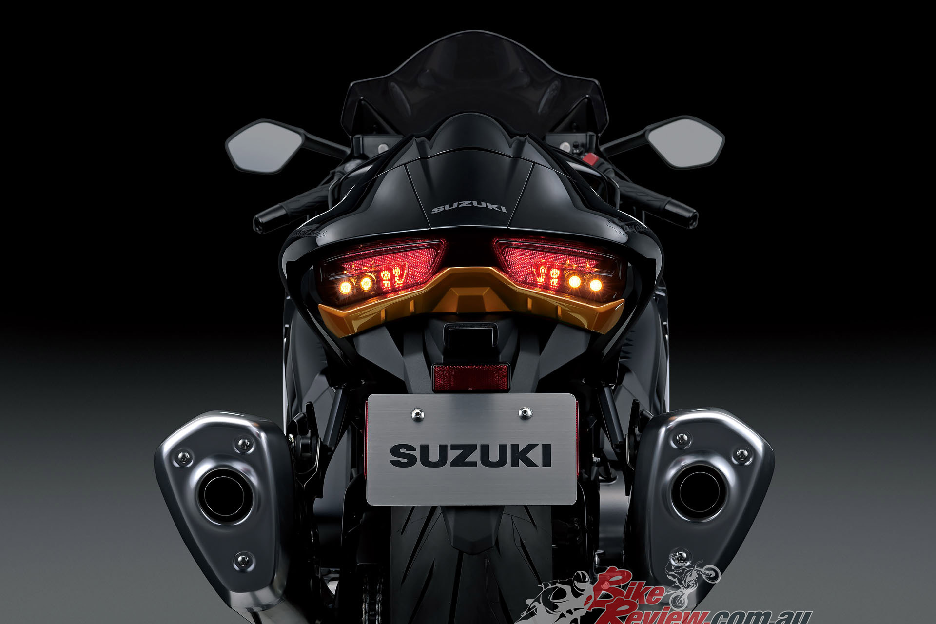 The bold new Hayabusa LED taillight and rear indicator design creates a single wide, sharp accent running horizontally across the bottom of the tail section. Each of the left and right combination lamps house the tail/brake light and indicators, with a clear lens over the taillight and a clear smoke lens over the indicator portion.