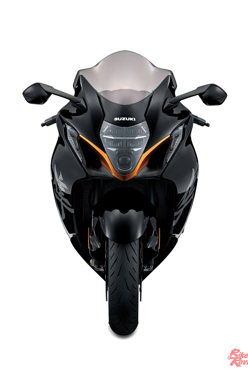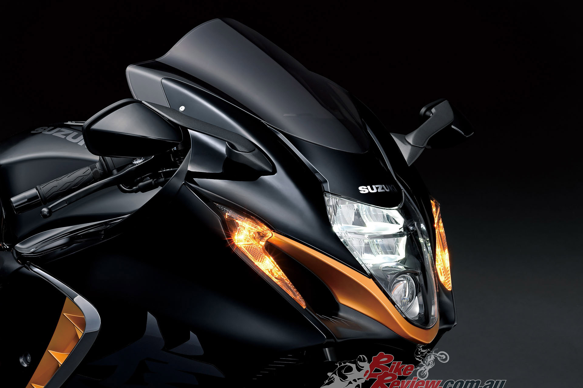 The Hayabusa’s vertically stacked headlight continues to feature intentionally large and, bold styling. Even so, the design for the new generation assumes a tighter, more angular look that nests neatly between the large Suzuki Ram Air Direct (SRAD) intake ducts and melds seamlessly with the narrower lines of the windscreen’s lower edge. Black parts incorporated inside its housing add a striking new touch and make the assembly less conspicuous. Flanking the air intakes are new position lights with integrated indicators. Together they form a single, clean vertical line that flows back along the cowling and does away with the bulbous protrusions as featured on previous iteration.