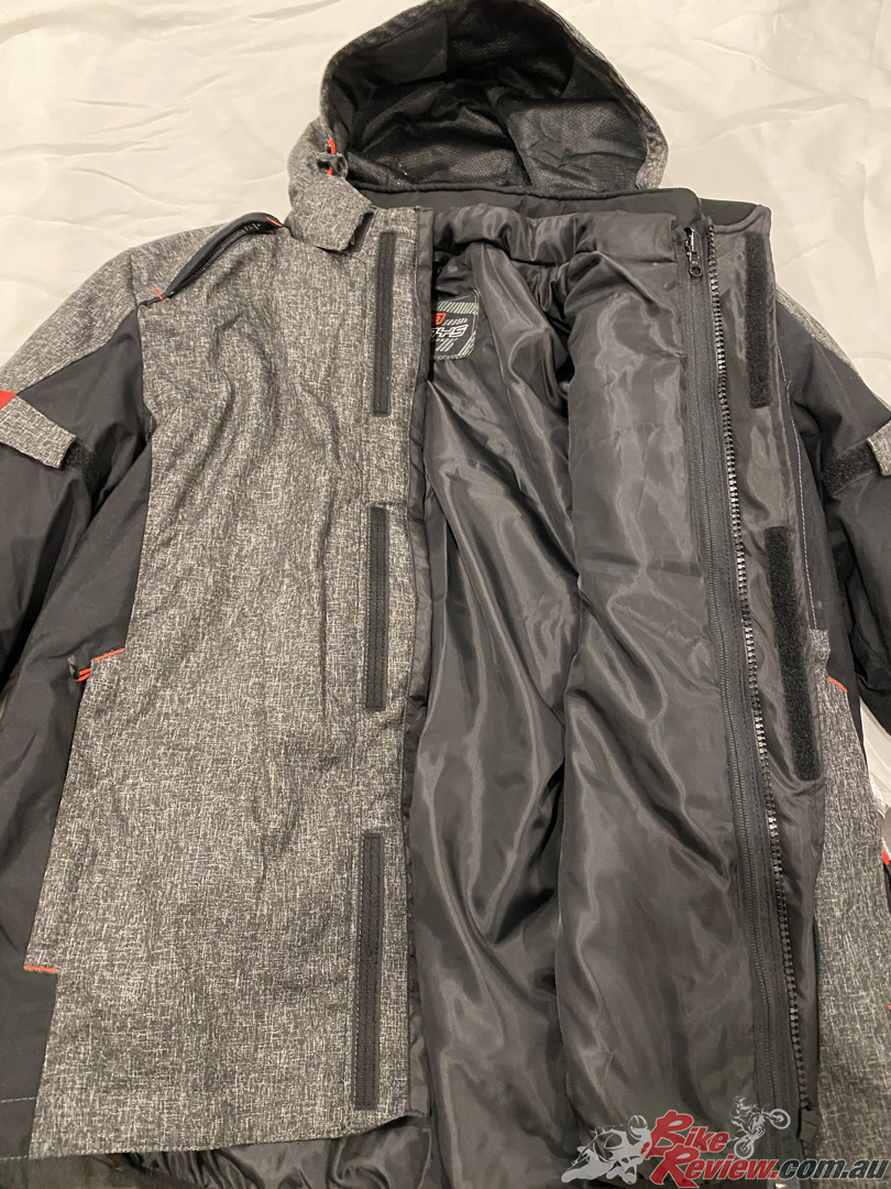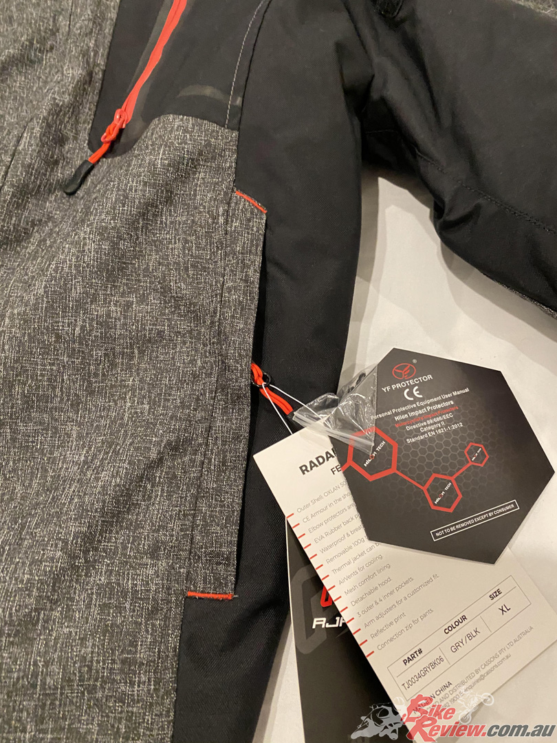 The Radar jacket looks sleek! RJAYS offer it from SM-XXXXL and retail it at $299.95RRP. The outer shell consists of a OXLAN 500D and 600D liner, both waterproof and breathable! The shoulders are protected with CE armour as well as a EVA rubber back pad insert.