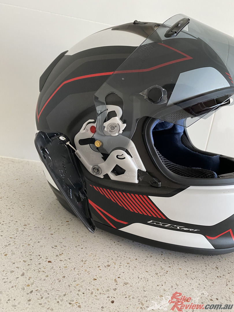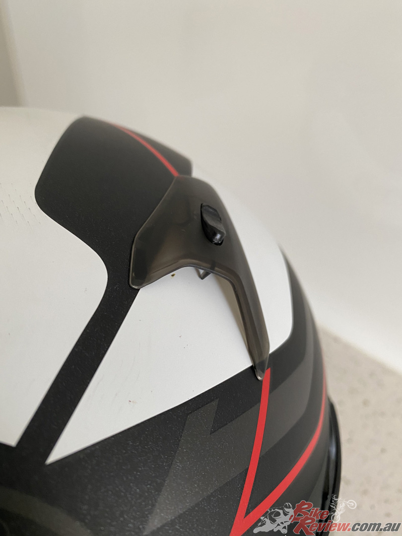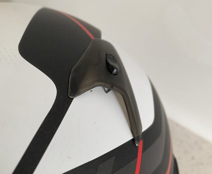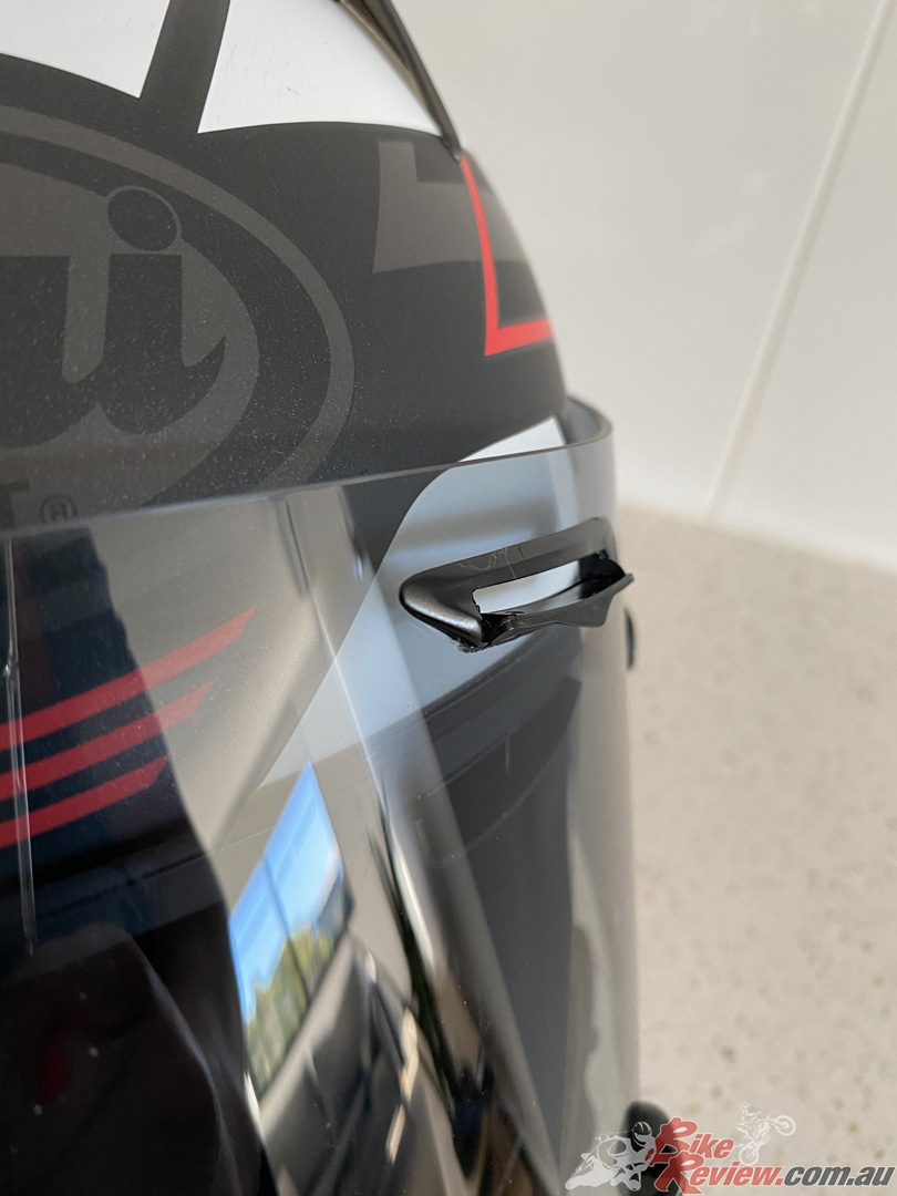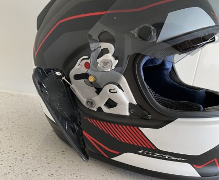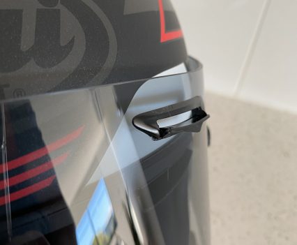 Plus, its got rear exhausts for a solid amount of ventilation. It’s got the F-1 inspired latch system which seems a bit tricky if you’re just looking to pop the visor up at the traffic lights… But we’ll see hey? The visor is pin-lock ready (a must have for my cold morning commutes) and it has the capacity for Arai’s optional Pro Shade System (PSS).