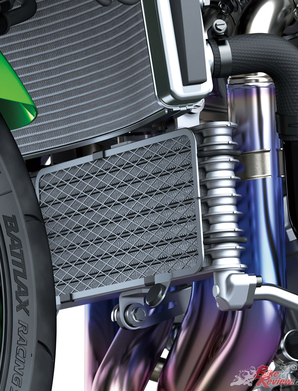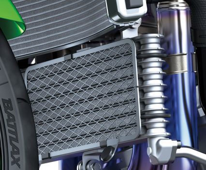 The new air-cooled oil cooler is a design often seen on high-performance models. Rather than routing coolant from the radiator to the oil cooler and back to the engine, the new oil cooler is air-cooled and has an independent circuit. Oil is routed from the left lower crankcase to the oil cooler, where it is cooled, then returned on the right side. The increased cooling performance contributes to engine performance at all rpm.