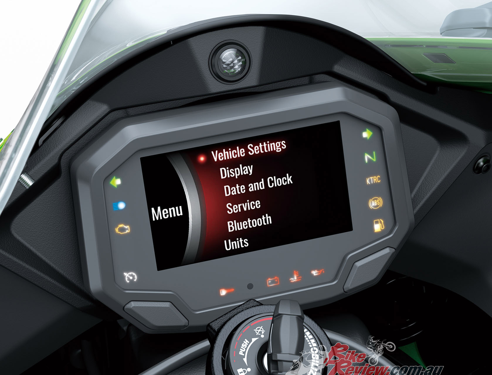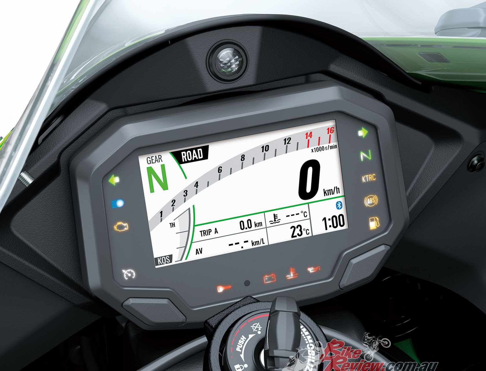 The Ram Air intake – a Ninja supersport trademark – has a new shape and is more compact than that of the previous model, but the design of cowl directs air toward the intake so its efficiency is unchanged. Winglets built into the upper cowl generate downforce that helps keep the front wheel on the ground on corner exits and during strong acceleration.