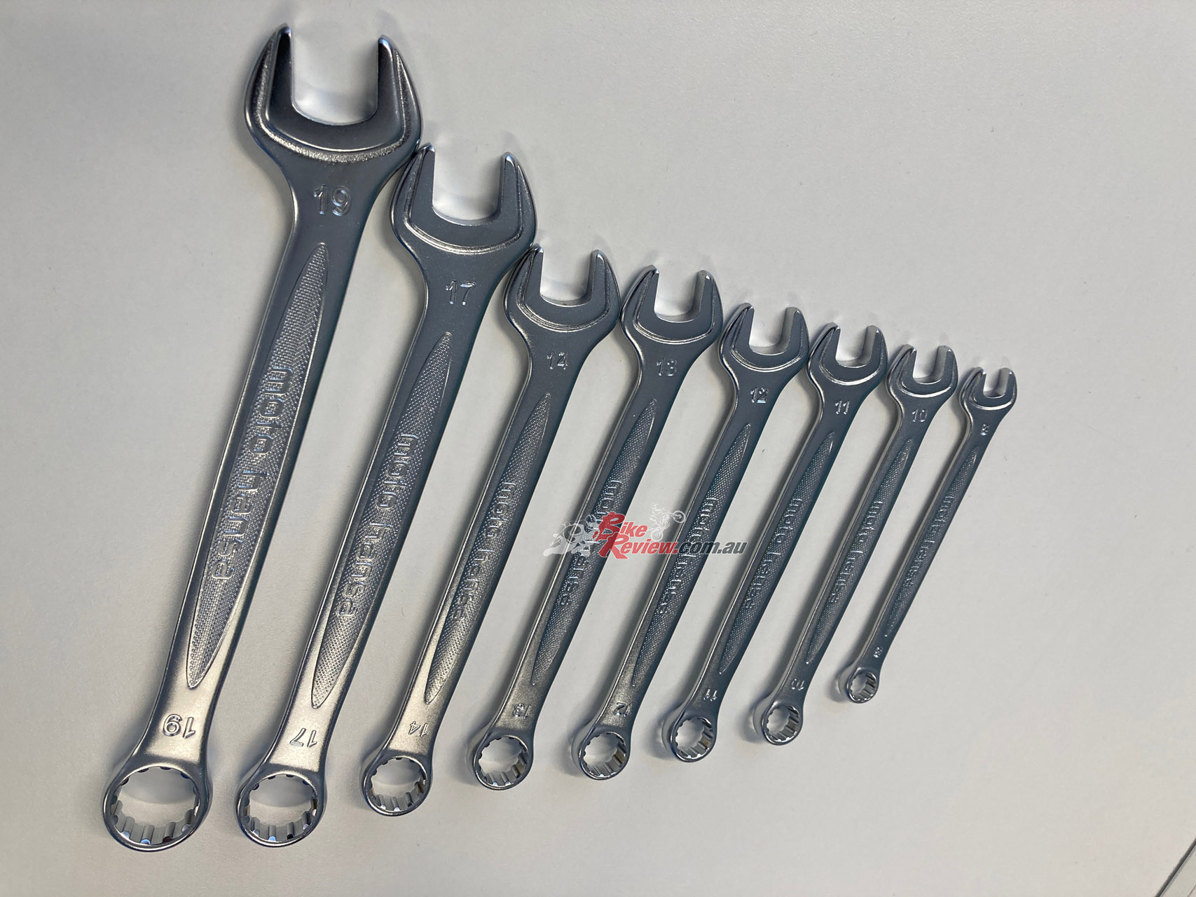 The open end spanners are a good fit, with generous head length and profile surface area allowing the jaw to grasp well.