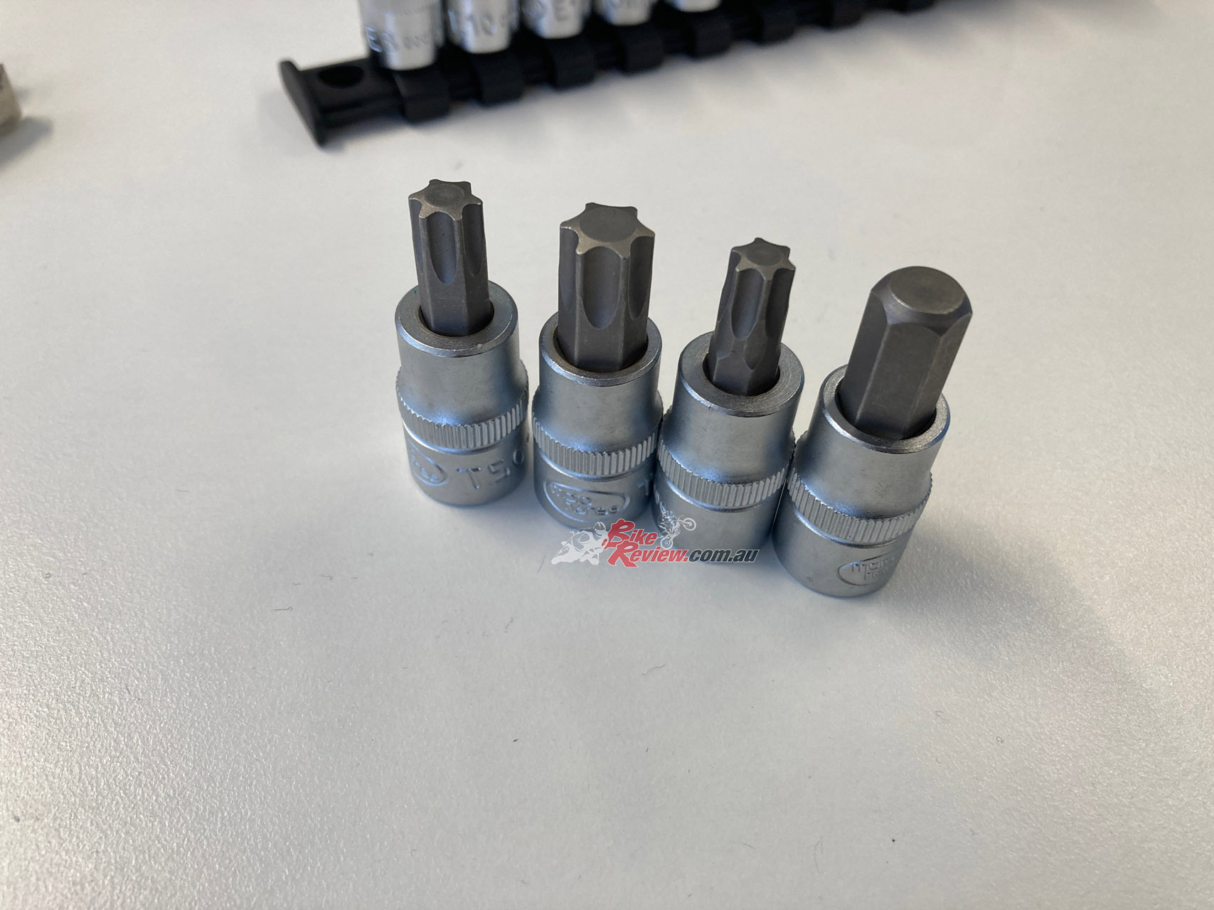 The sockets are decent quality and a good fit, while the various hex drive bits are also good quality and range from flat sided, Phillips head, Torx and Allen bits. There are larger Torx bits for 3/4-drive use, and there is an extension bar, vice grips, and a very nifty multi-purpose T-bar/driver handle as well. I highly recommend Motohansa Tool Bags, there are a variety and there should be something for you…