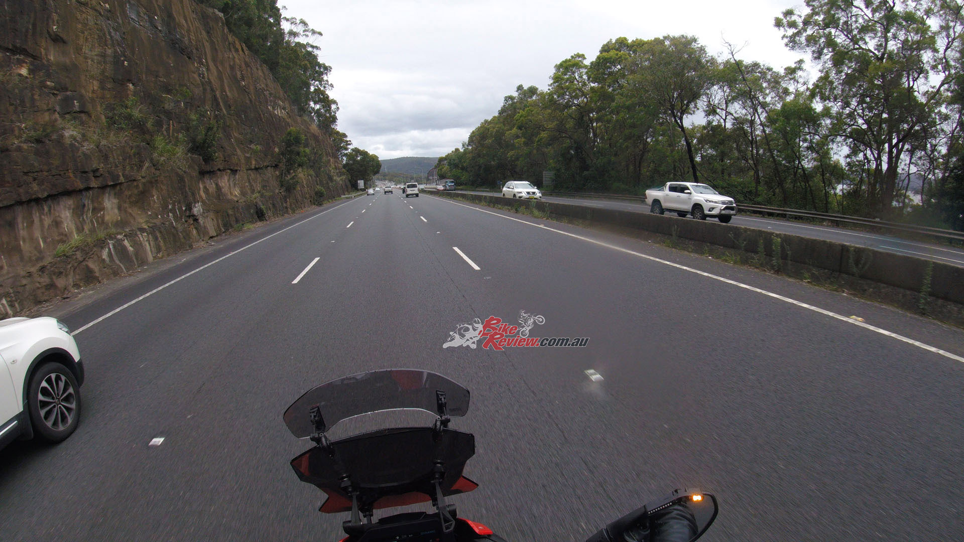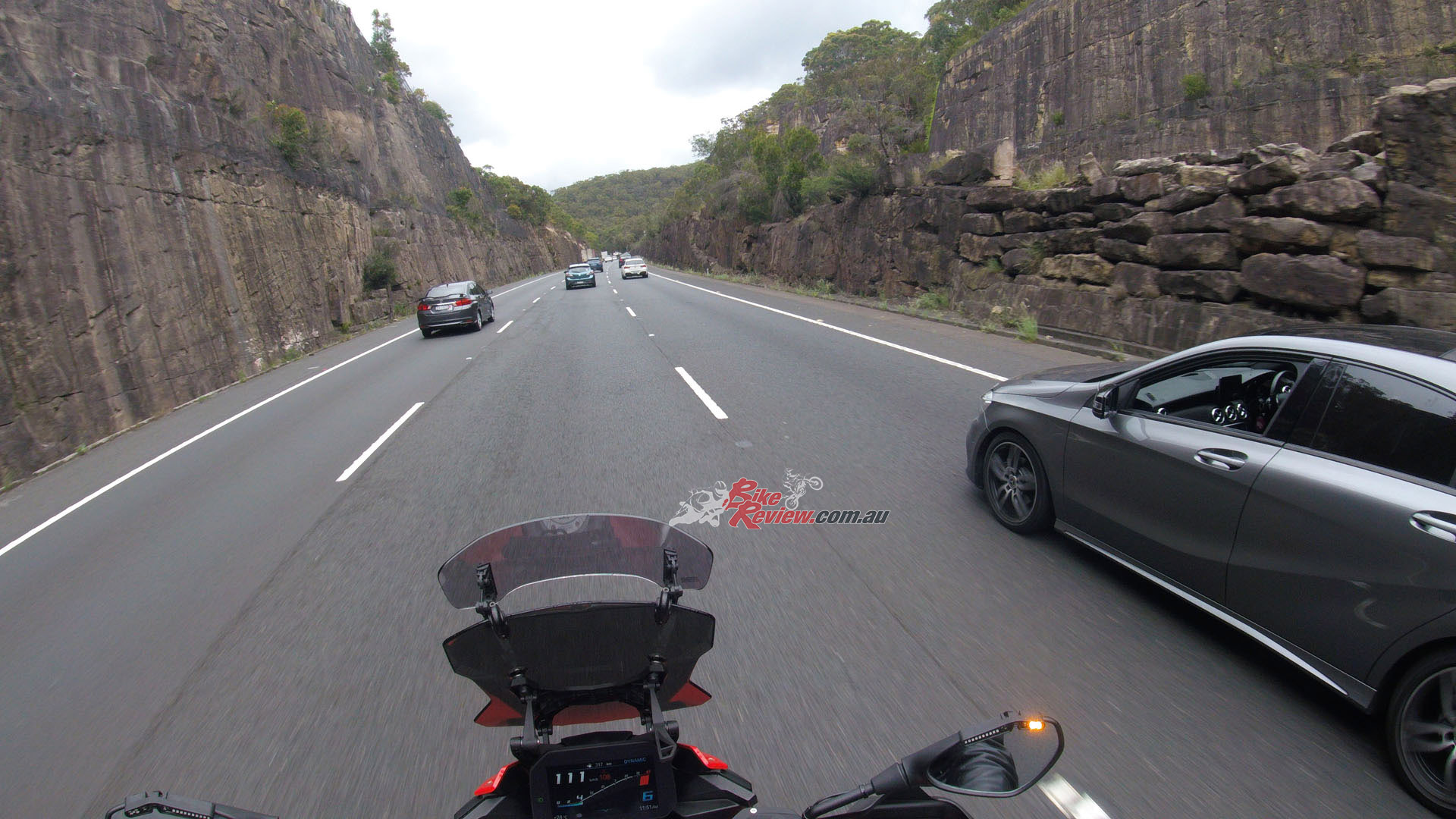 It was out on the M1 Motorway riding with traffic flow at 110km/h on a three lane section that the Ride Vision system truly worked to perfection, helping me stay aware of what was happening around me in a 360 degree circle when added to my own visual field. This is approaching slowed traffic.