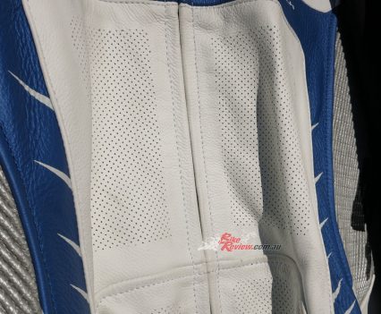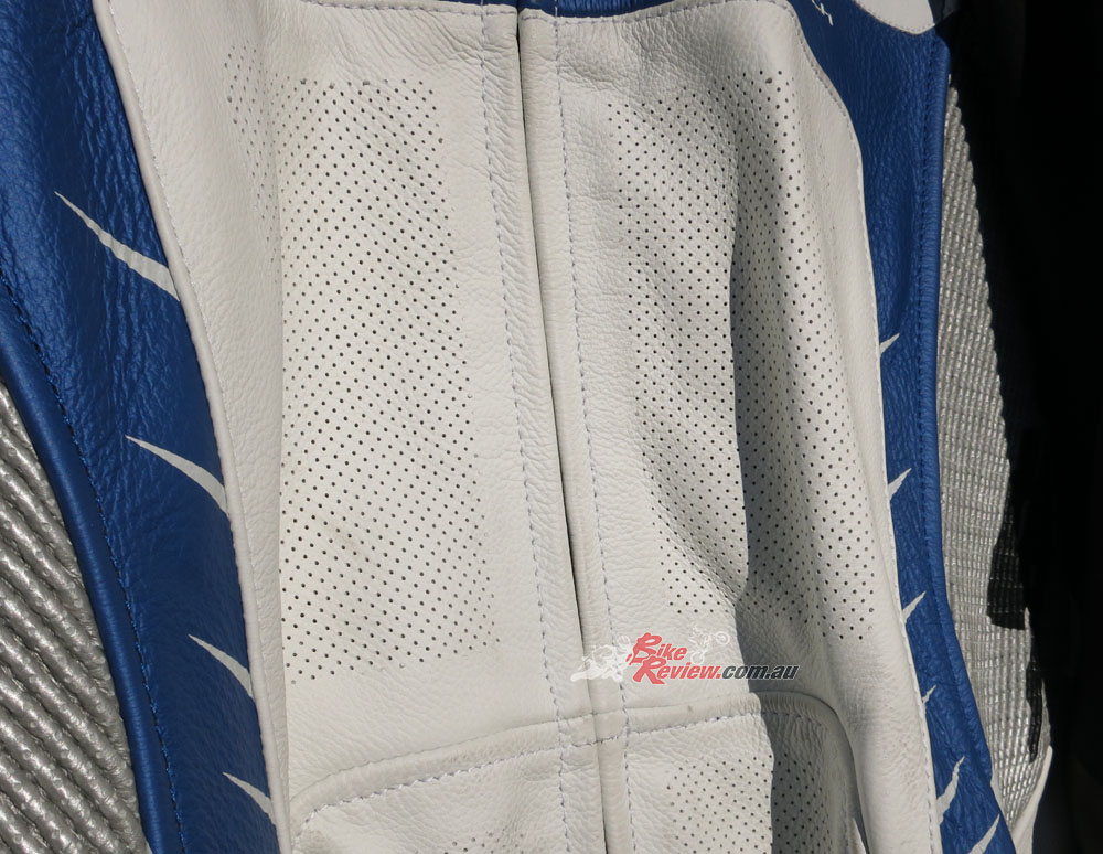 The main body of the suit is lightweight ultra tough 1.1 to 1.3mm thick Italian perforated cowhide and features top quality YKK zips and a removable, washable mesh inner lining secured well by Velcro and press studs.