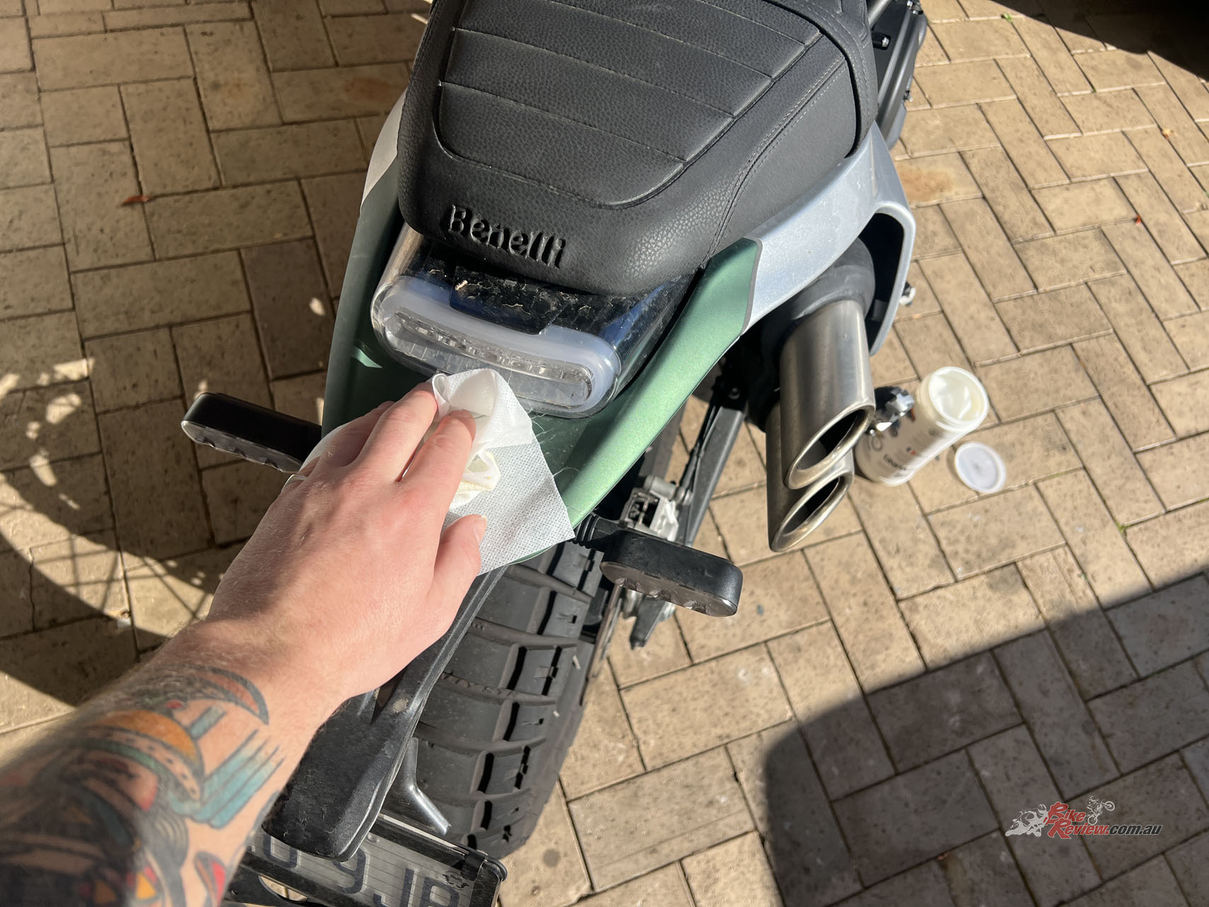 Starting at the tail, you can see the bike has plenty of caked-up dry dirt. One pass over the bike with the wipes and they clear off all of it, I go straight over it with the microfibre cloth and what’s left is a better shine than what I’d be able to get with a bucket of soap and a sponge, at a fraction of the time.