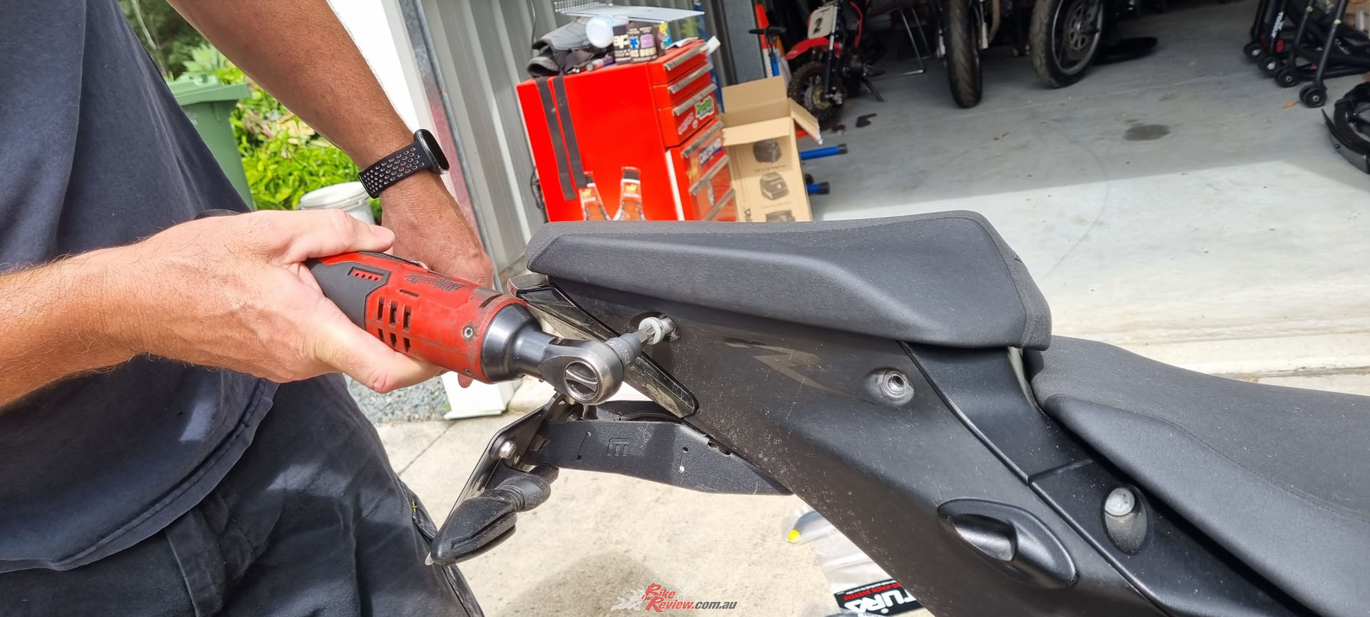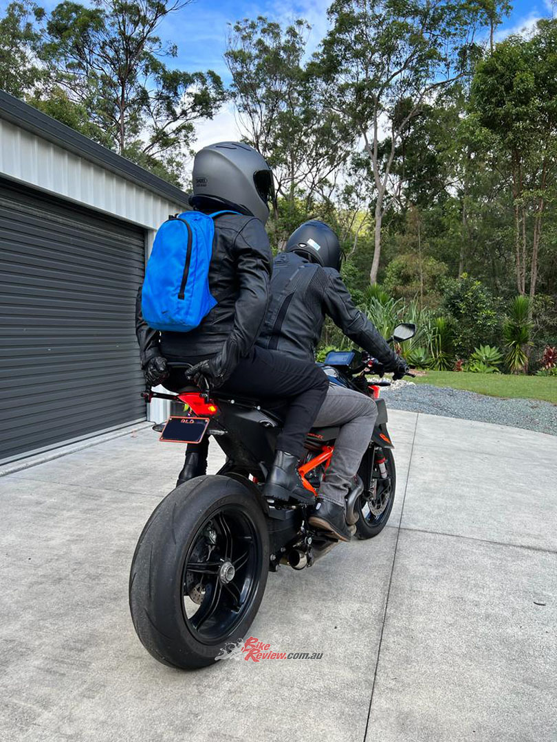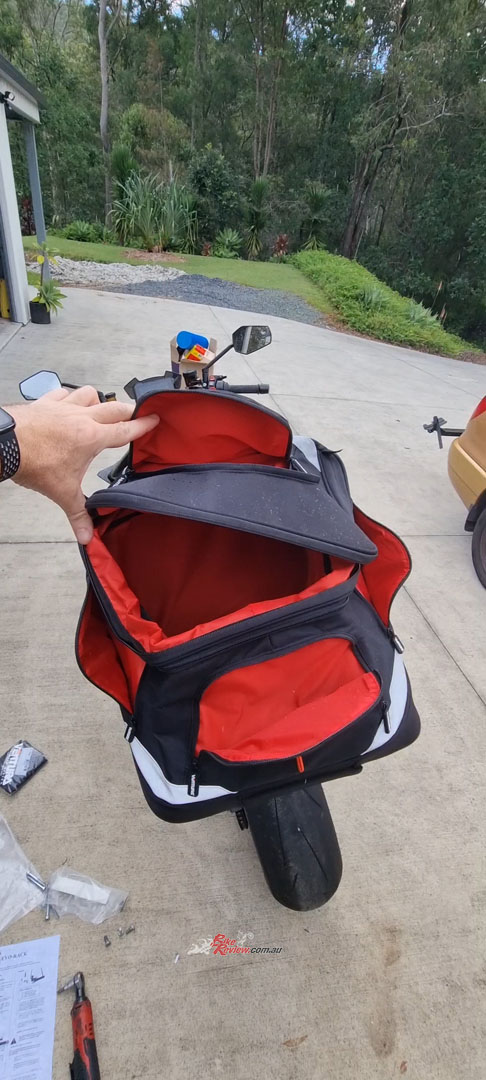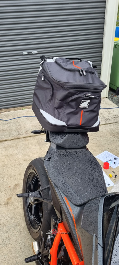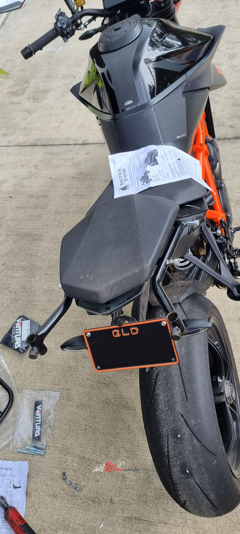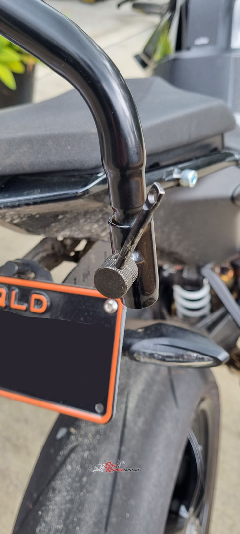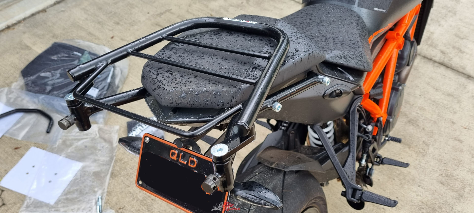 On this model, it is just a simple process of removing the two bolts on each side of the pillion seat and bolting on the two side runners. This then leave the two uprights ready to accept either the rack or the pillion grab rail. Simple, huh? Mind you, on the KTM model, the grab rail does look like some old school stunt bike wheelie bar, but it keeps her happy so I’m cool with that.