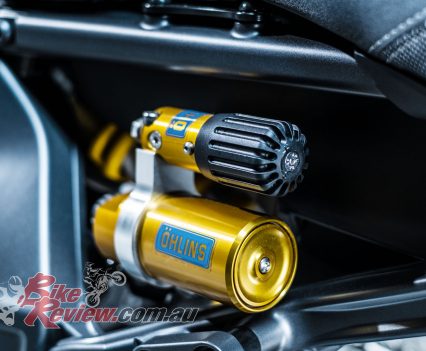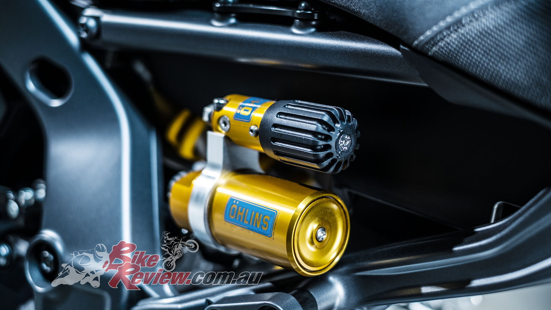 On the SP, the new front forks are equipped with low and high-speed compression damping adjusters for accurate tuning of the suspension. To match the new front suspension, the rear suspension system features a premium specification Öhlins rear shock absorber, offering the rider adjustability for compression and rebound damping. Equipped with a remote preload adjuster that enables quick and easy setting.