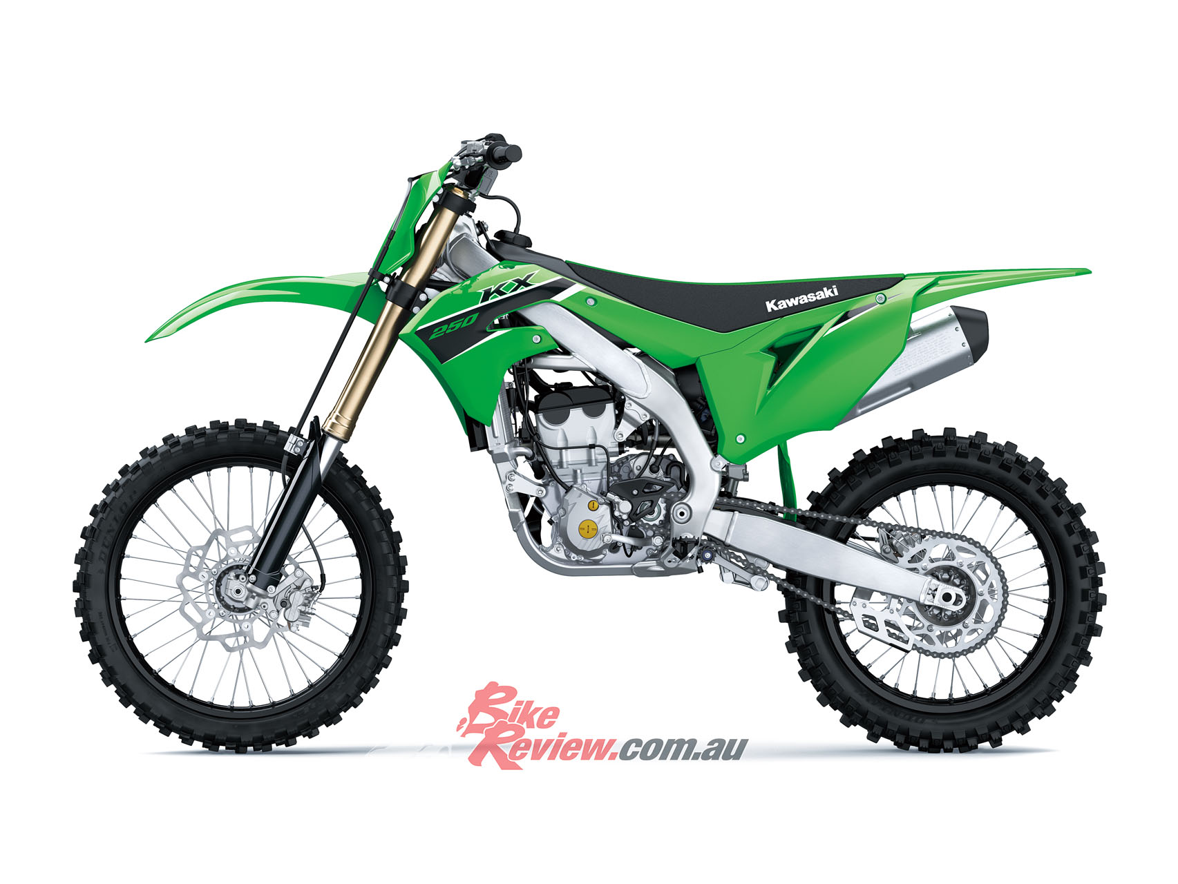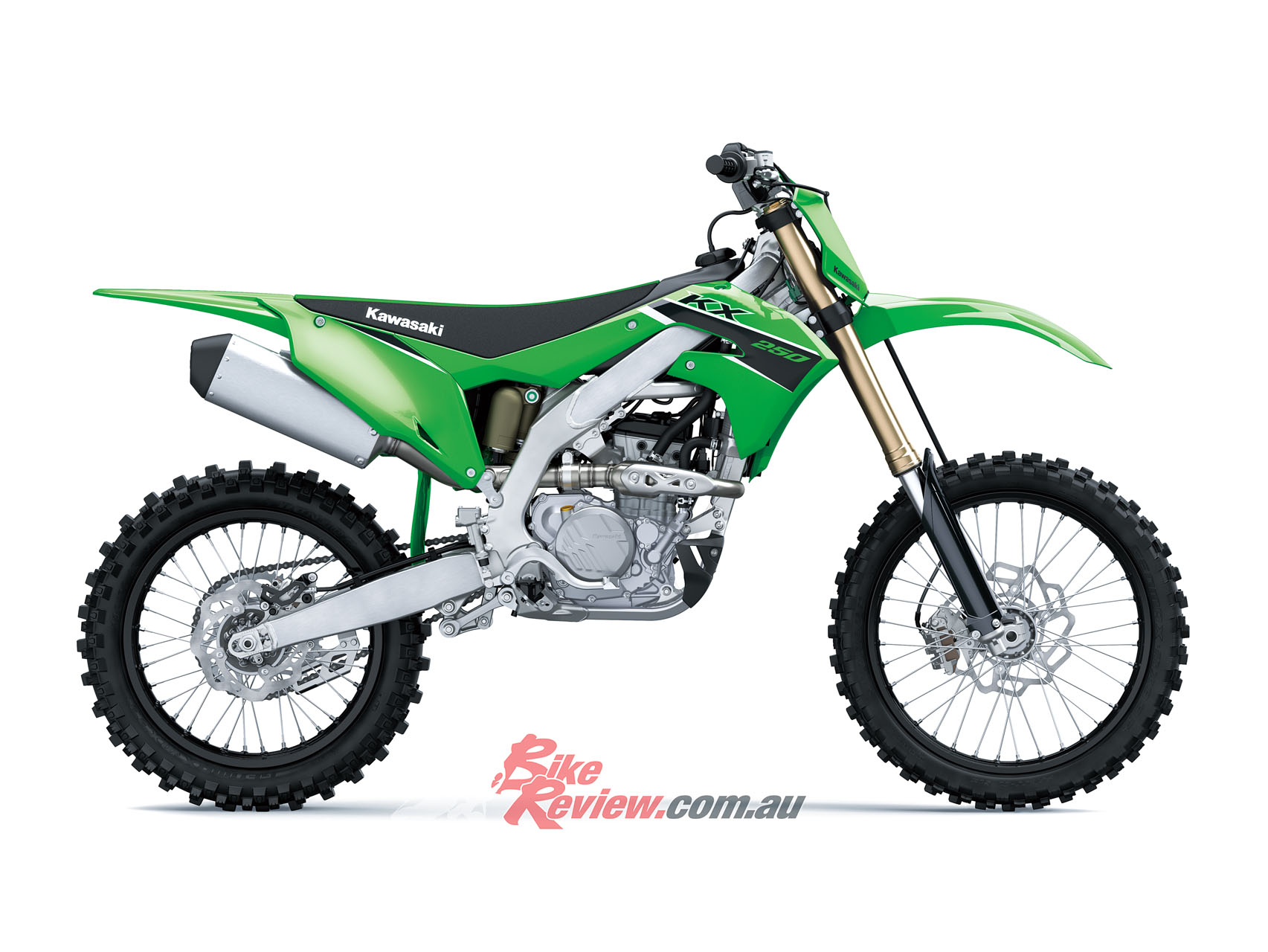 All the vital components of the KX250 matrix remain. The KX450-based aluminium perimeter frame, electric start, adjustable ergonomics, petal disc brakes, factory-style launch control and three separate engine maps; maps are programmable with the accessory calibration kit. Weight is 108kg with all fluids (full fuel tank), and the livery is signature Kawasaki Lime Green.