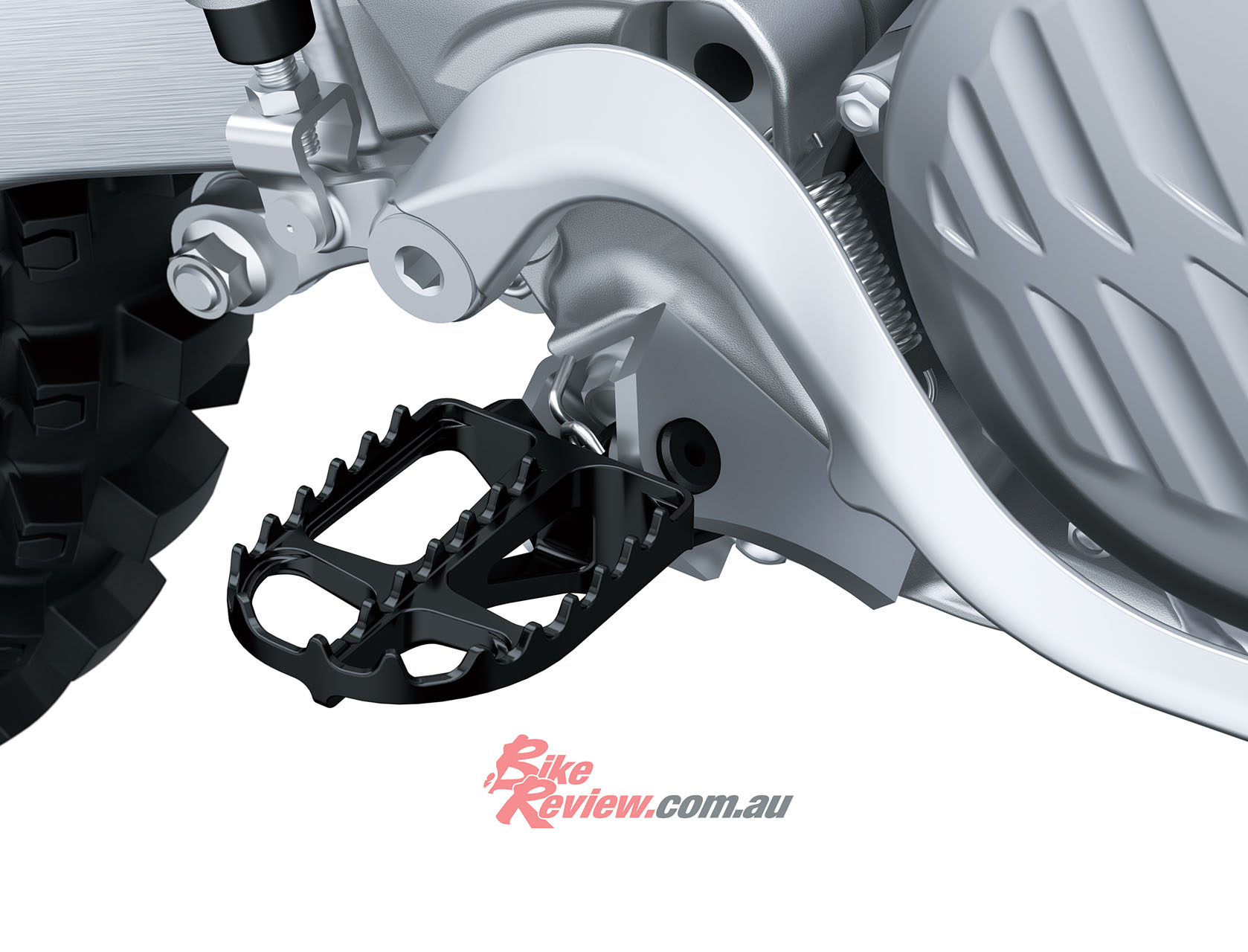 The footpegs have weight-saving aluminium brackets instead of steel – offsetting the extra weight of the larger rear tyre. The Uni Trak rear suspension has dual low and high-speed compression adjustment. The suspension arm is affixed below the swingarm to promote a longer stroke and more precise tuning parameters.