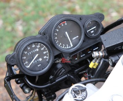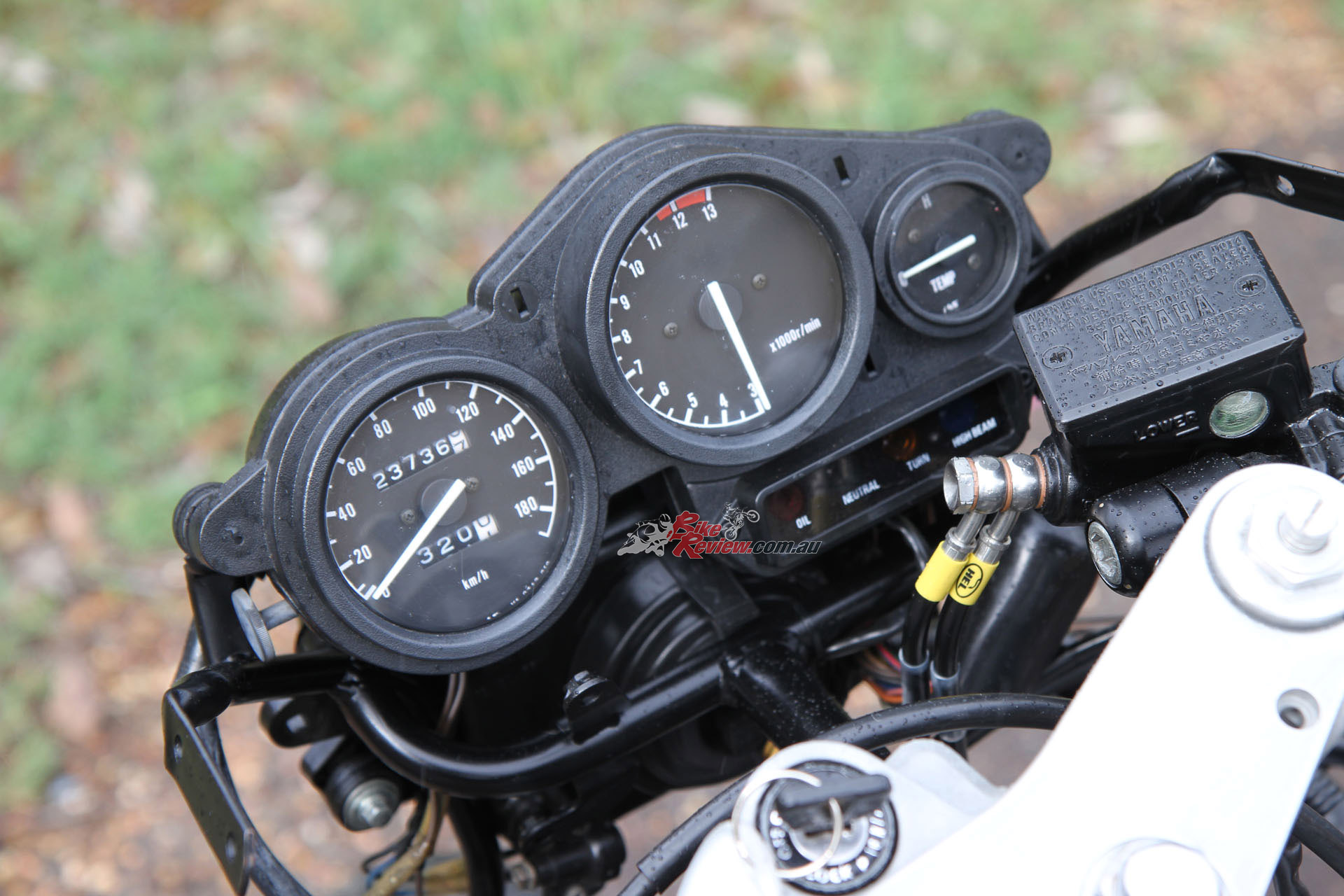 Instruments: Analogue speedo and tacho, analogue temperature gauge, warning lights for oil, temp, indicators and high beam.