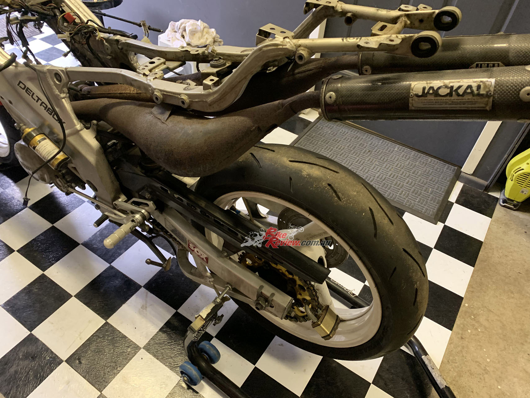 Chassis: Alloy Deltabox frame with alloy swingarm and triple-clamps