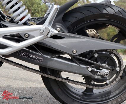 The DOHC liquid-cooled 313cc fuel injected engine fires into life easily. It idles away with some mechanical noise from the valve train. The engine has a reverse-cylinder. BMW claim this is to help shift the weight of the engine further forward and to help mid-range. I’m not convinced, I think it is marketing. One definite advantage is the pipe exits straight out the back, leaving room under and forward of the engine for positioning. However, the airbox is above the radiator and would get lots of hot air and the engine is more mid-mounted. There is a long swingarm, an advantage for high horsepower bikes with a tendency to wheelspin. Not such an issue here… but with no shock linkage the length will help. BMW also wanted the trademark planted front feel they are known for, according to their press kit, but the G 310 R mass is more central in reality.