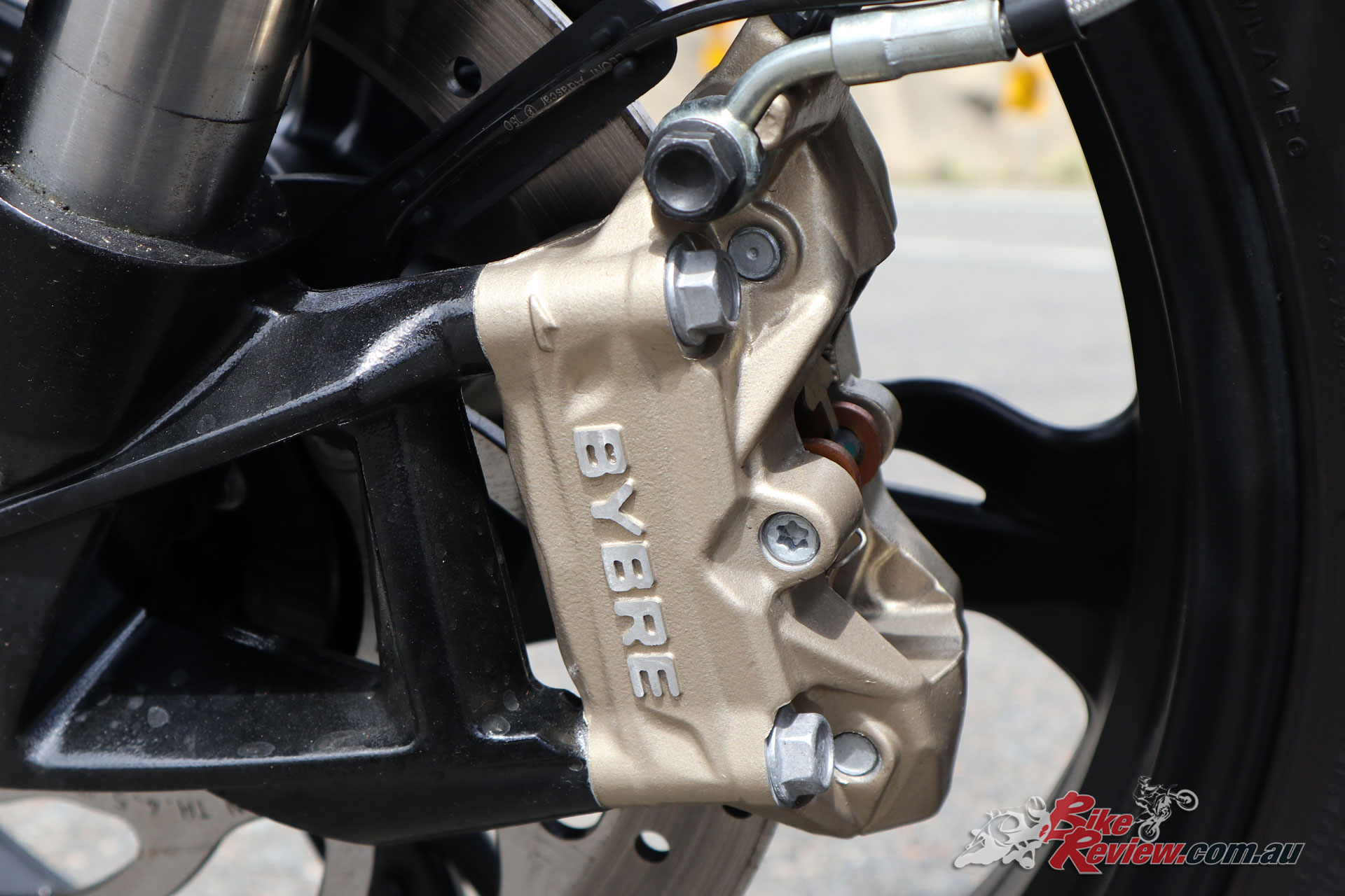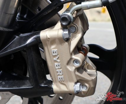 Brakes: Brybo four-piston radial-mount single caliper, 300mm rotor, two-piston caliper, 240mm rotor, ABS.