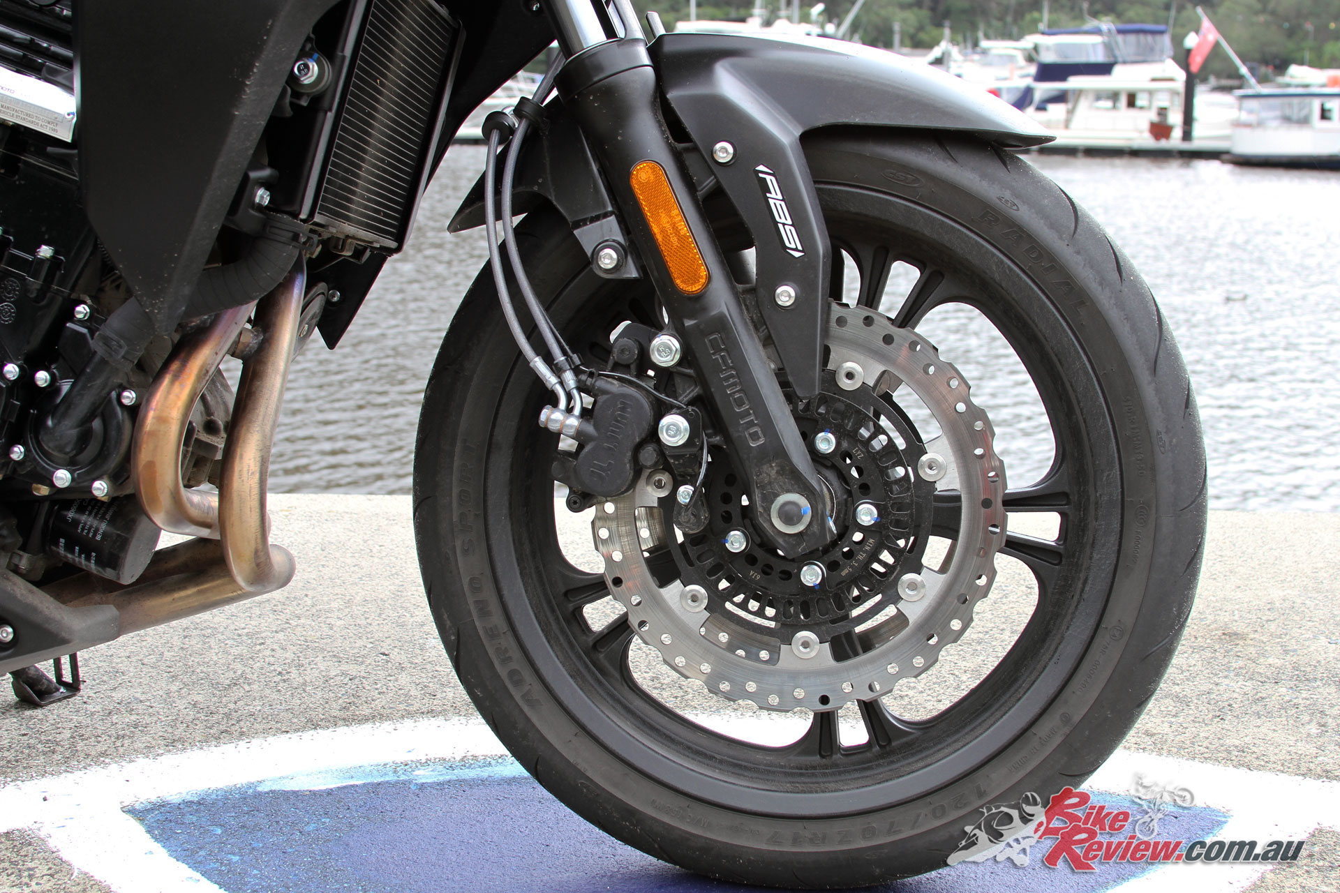 Brakes: Front: Twin-piston calipers, 300mm stainless steel rotors. ABS.