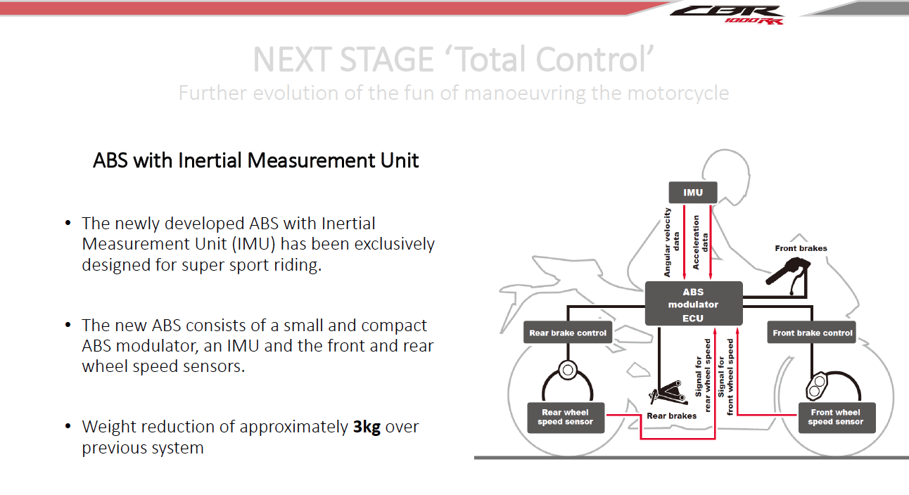 The new ABS and IMU is designed for sports riding and the entire ABS system weighs 3kg less than the previous model. With information from the IMU plus the front and rear wheel speed sensors, the ABS modulators controls brake force according to lean angle.
