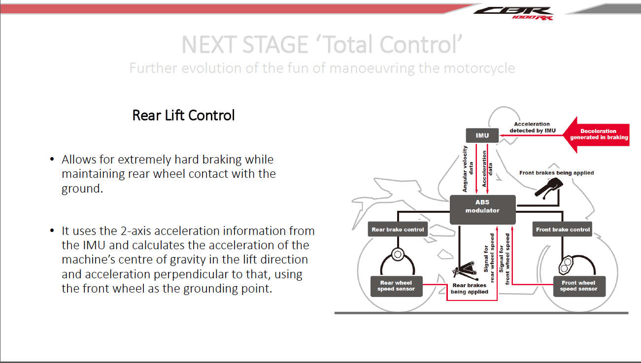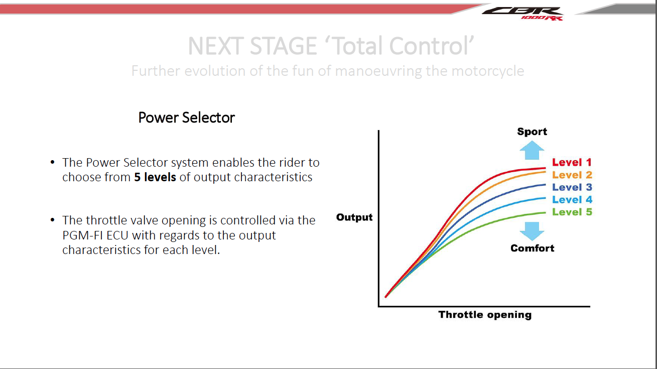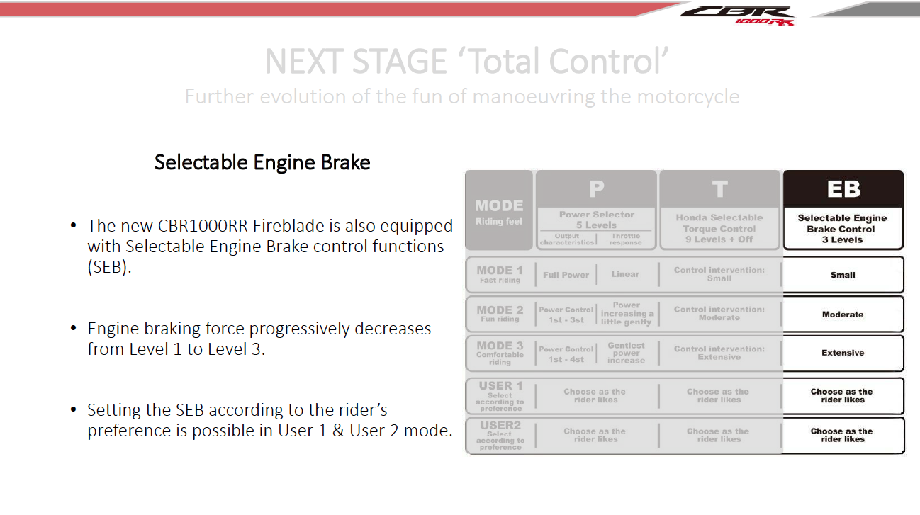 You can also turn the HSTC system off. There is also wheelie control (mitigation of front wheel behavior). The new Fireblade also has Selectable Engine Brake SEB. There are 3 levels of engine braking available. There are also 3 pre set rider modes to choose from (see diagram in gallery).