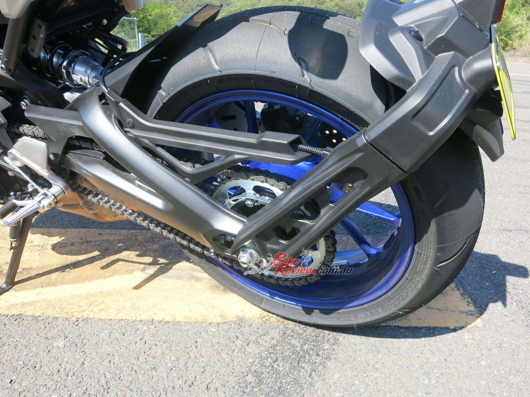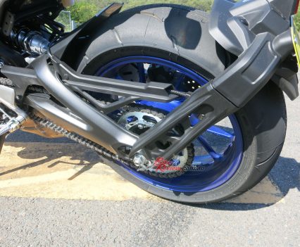 With Dunlop Sportmax fitted to our press test unit, along with track setting from Yamaha, our bike was on rails on smooth tarmac and with the hero blobs removed from the footpegs ground clearance was no issue. It really was fun cornering the MT-09.