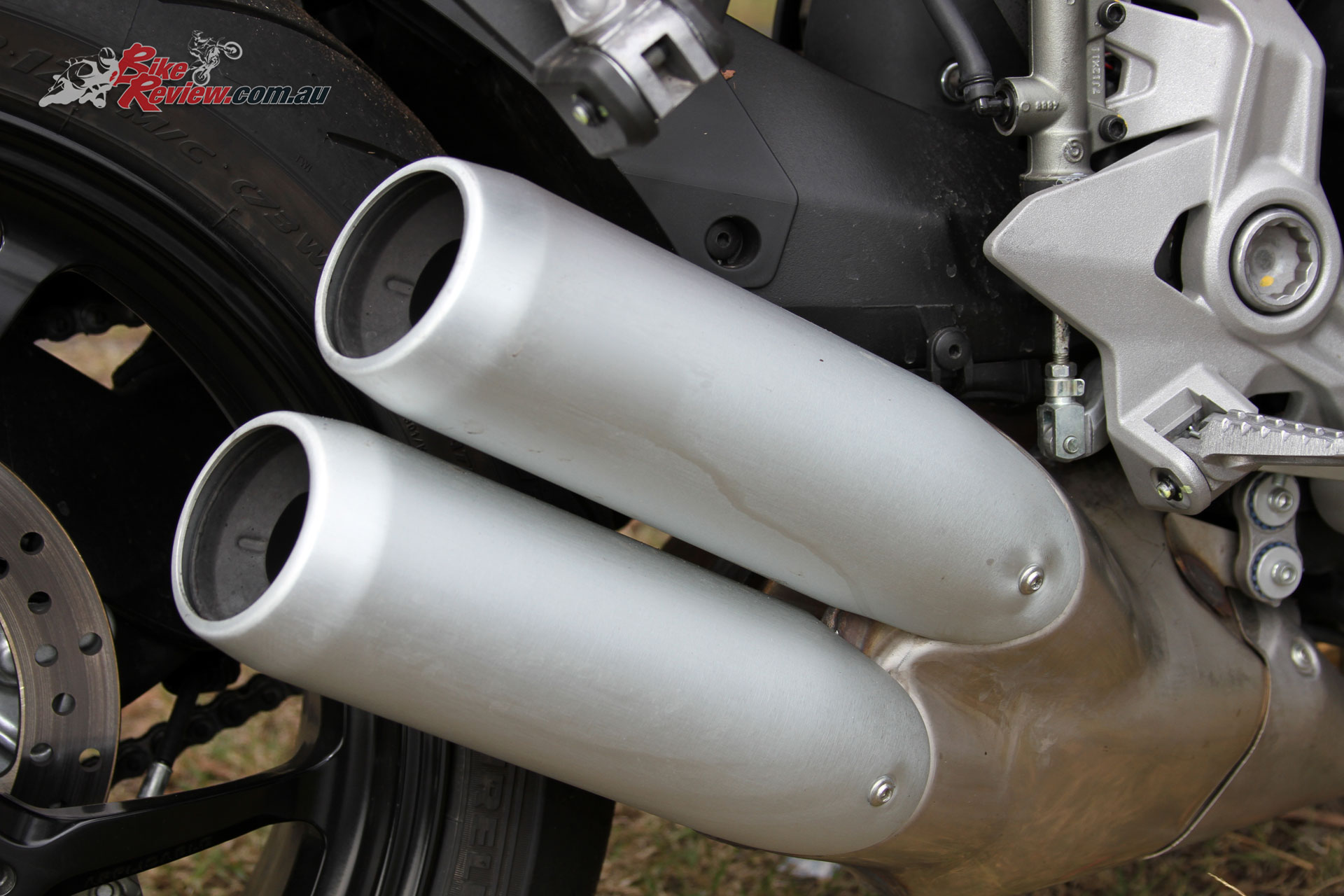 Single-sided swingarm and Y-spoked wheels look great. The collector box not so much. The note is good though.