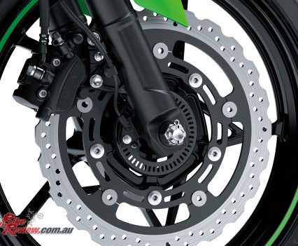 The front brake features a class leading 310mm semi-floating disc and twin-piston caliper. The new master-cylinder reduces idle stroke so less travel is used to re-compress the fluid, and coupled with matched hose dimensions and materials, provides better feel and control. ABS is now standard, controlled by a Nissin module that is currently the most compact and lightest available. Rear brake is a 220mm disc and twin-piston caliper with larger 27mm pistons.