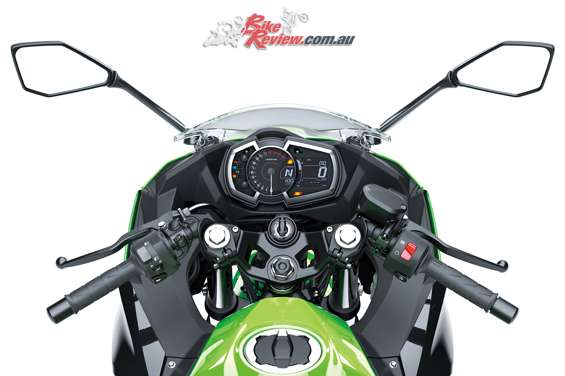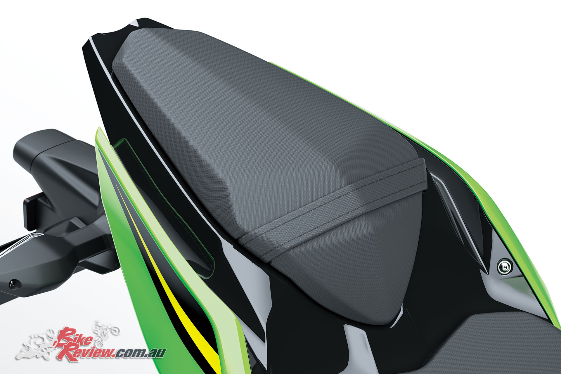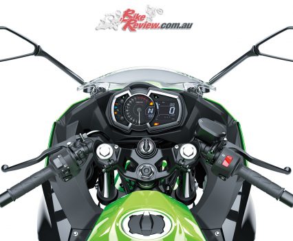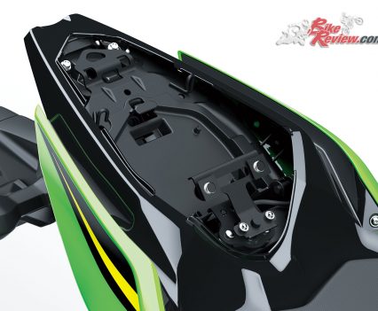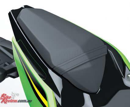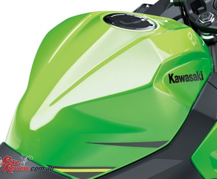 Svelte, H2-style bodywork sheaths most of the bike, pulls air from the engine area and also directs air around the rider. The 14 litre fuel tank is narrow at the back and corresponds to the 30mm slimmer frontal area of the seat to improve leg reach and assist easy manoeuvring on the move and in traffic situations.