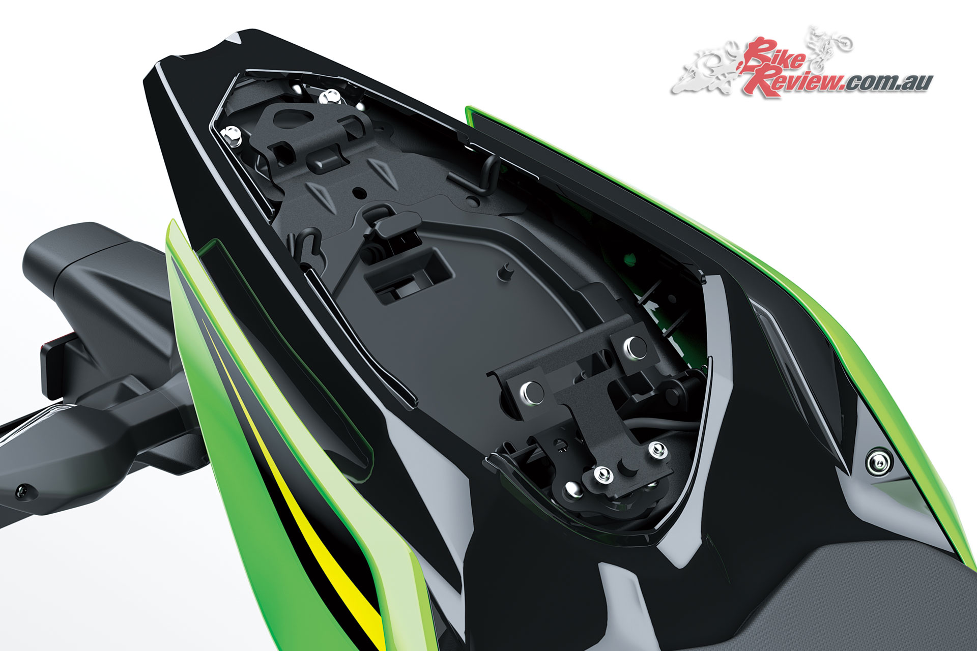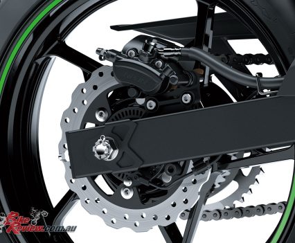 The box-section swingarm and rear suspension attaches to a H2 inspired die-cast aluminium mounting plate that fixes directly to the rear of the engine, eliminating additional frame components for supporting the swingarm.