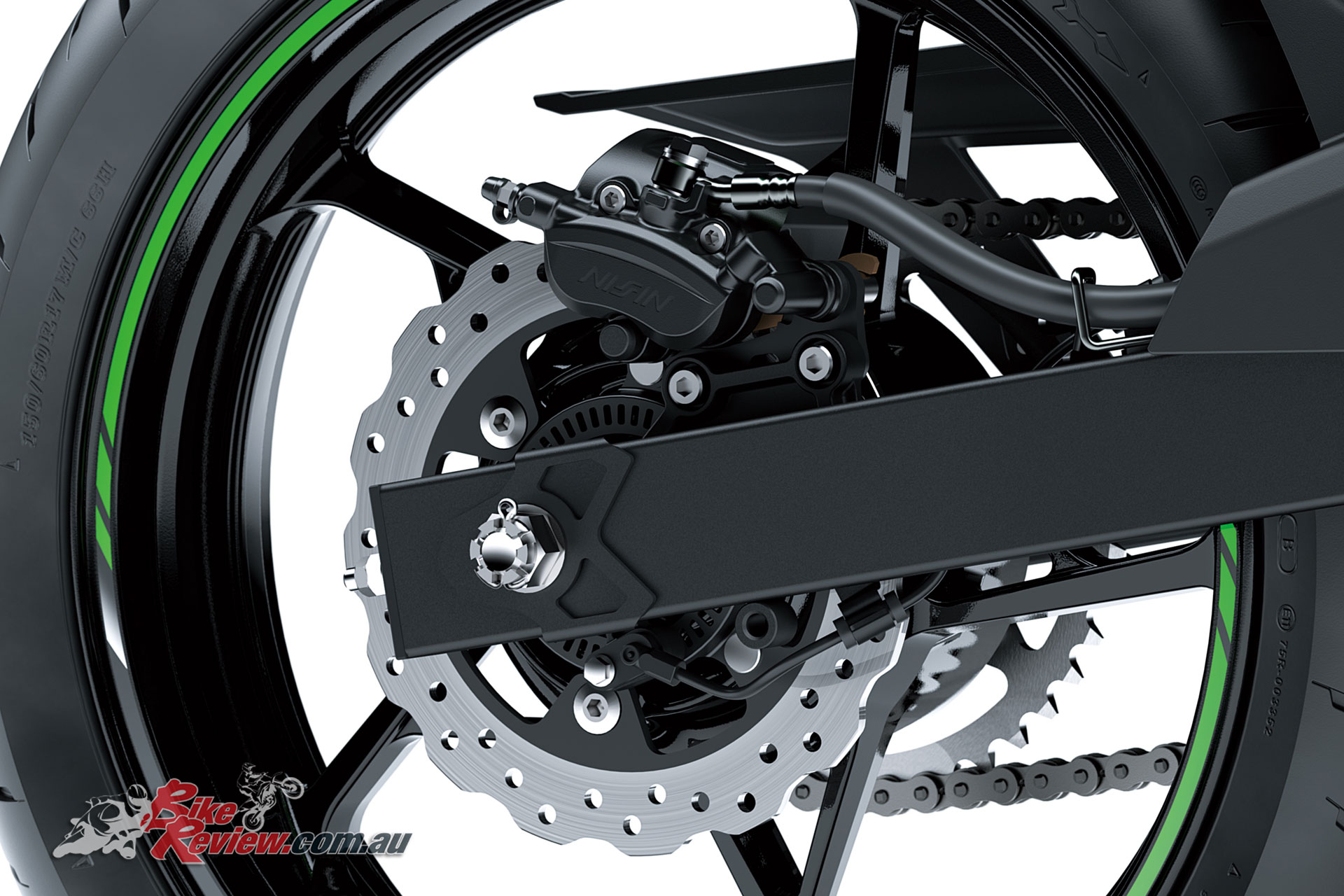 Wheels are race-inspired 5-star-spoke patterns items that feature optimised lateral rigidity and light weight to assist ease of handling and corner stability. Tyres are now radial type, with the rear a 150mm section for more road contact and improved appearance.