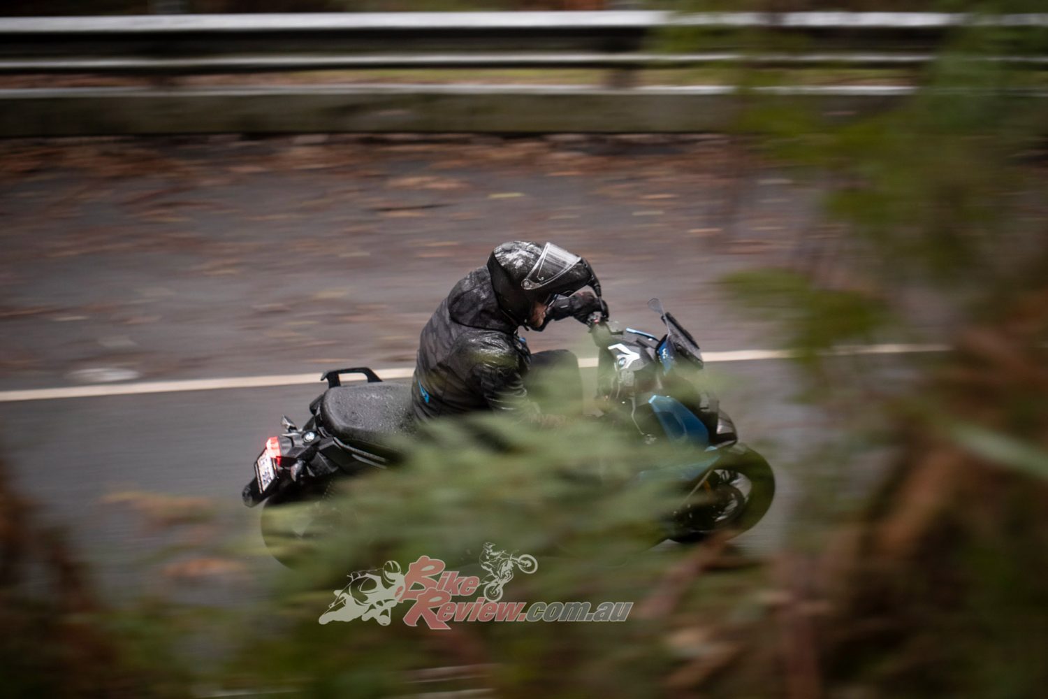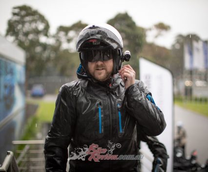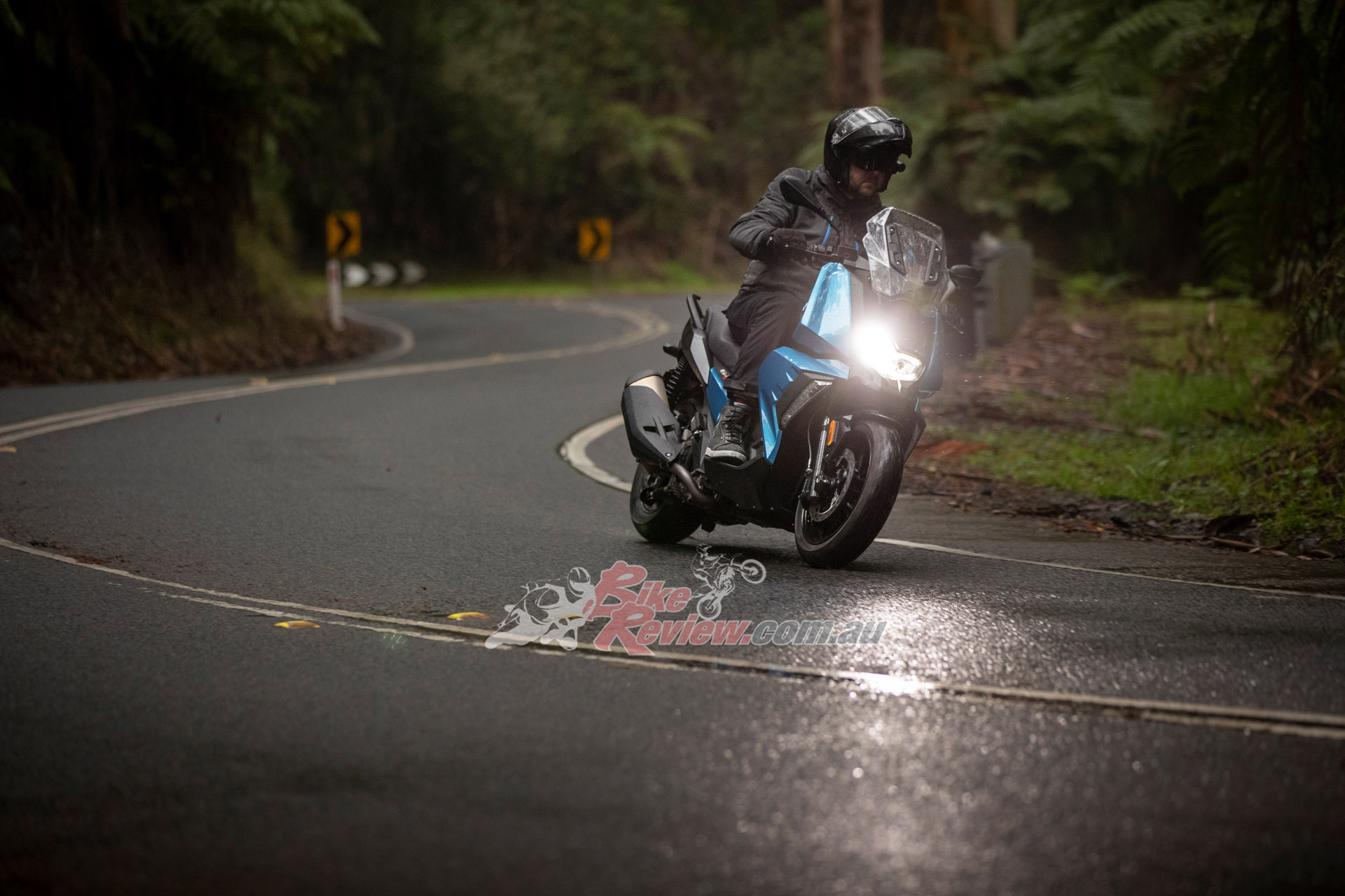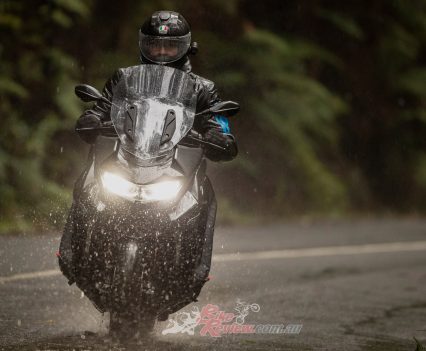 Up in Victoria’s Dandenong Ranges it is freezing cold, foggy and pissing rain but I’m feeling content on the little 400 X with the heated seat and grips cranked up and my fully waterproof gear on. The only issue I’m having? A foggy visor, as I forgot to fit a Pinlock. I have to ride with the chin of my modular AGV up but luckily the small screen on the X actually does a top job deflecting wind and water. You can see how wet and dark it is in the photos and video.