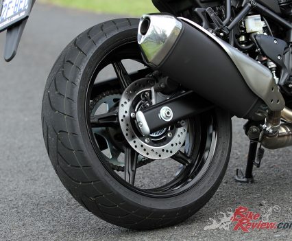Wheels are five-spoke cast aluminium light weight offerings with a sporty appearance, and Dunlop radial tyres are fitted as standard. The SV650’s wheels are 3.50 x 17in and 5.00 x 17in, taking 120/70 – 17 and 160/60 – 17 tyres.