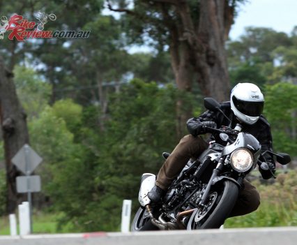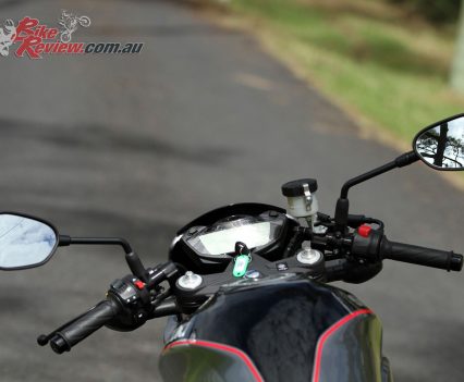 The bike feels light and flickeable at speed and at the speed limit. U-turns and low speed riding is a little trickier, the front feels a bit heavy and awkward at times in stop start traffic and very tight turns but that is a trade off for the styling of the ‘bar mounted fairing and light/dash plus the clip-ons. Once on the move it’s all forgotten.