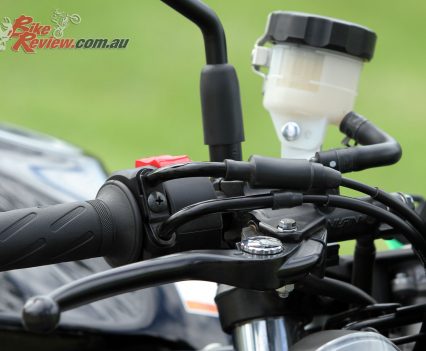 Looking further down, the liquid-cooled, 90-degree 645cc V-twin engine hangs from the black steel trellis frame and isn’t what I would call showcased. There is a lot going on with the cooling system plumbing, cables, wiring and so forth so it all looks a bit of a mess and could do with neatening up, something that would be a good customising project for an owner. The two-into-one exhaust system isn’t exactly pretty either but really, for this price, it seems rude to complain!