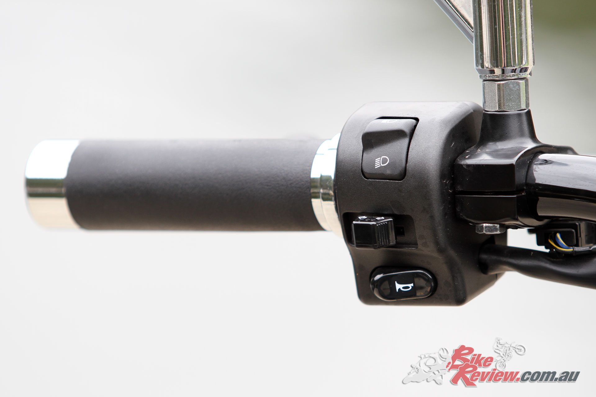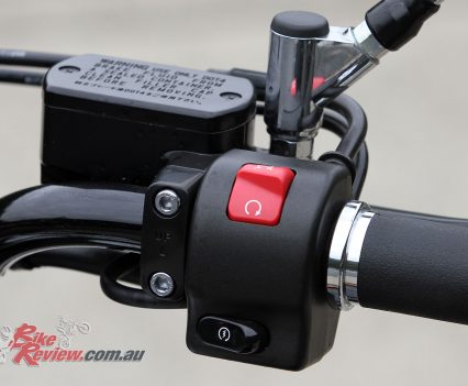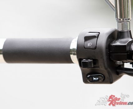 The textured rider seat is just 695mm off the ground, and simple forward controls are featured, with a slightly heavy clutch pull and ‘bars that extend up and back to the rider. For my 180cm frame the ‘bars offer a comfortable and ideal reach, with a relaxed relationship between the seat, ‘bars and forward controls.