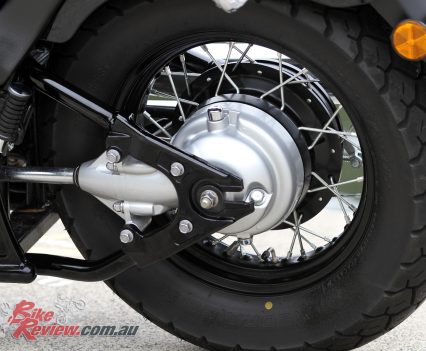 Cross-laced spoked wheels are a 19in front and 15in rear, and take tubed tyres. The rear brake is a 200mm drum system