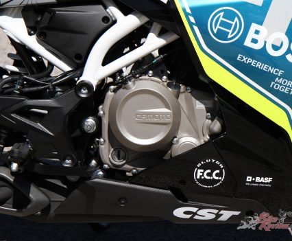 Holding the plot together is, from what can be seen, a nice looking steel tube trellis frame that is reminiscent of KTM machines. The suspension includes 37mm USD forks up front and a monoshock unit at the back. These are non-adjustable bar rear preload. The brakes are Spanish J.Juan units and feature a four-piston caliper at the front. Lightweight wheels and CST radial tyres hold everything up for a very handy 165kg wet weight.