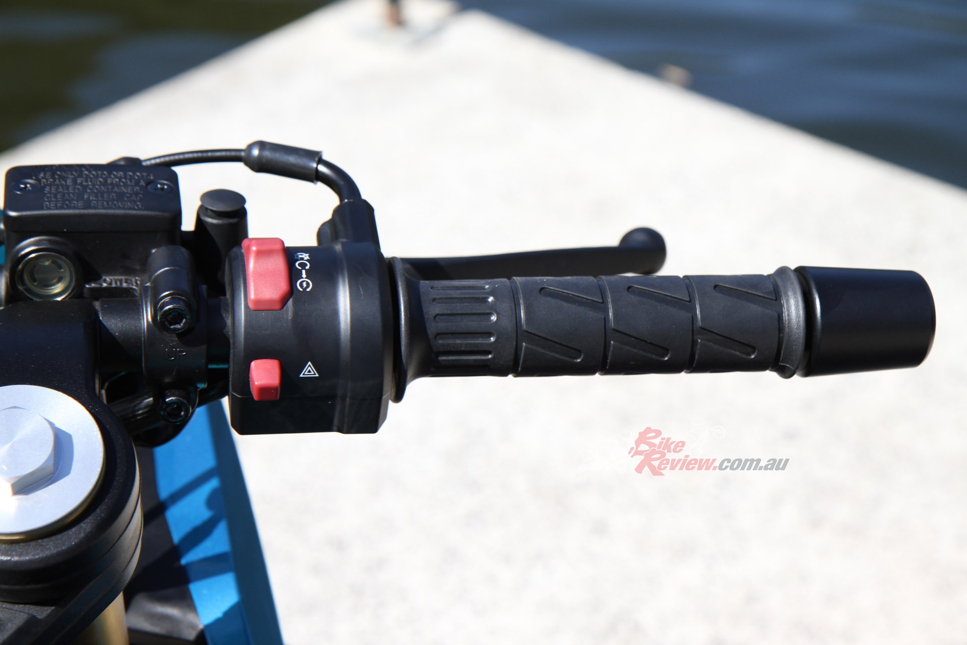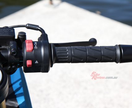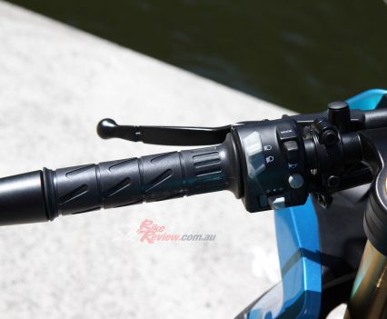 When you start the bike, the screen comes to life with an animation of the slick looking LED running lights – very cool. In fact, the bike features full LED lighting. If you like to connect your ‘phone to your bike, you can do that also. The handlebar controls are conventional and present no problem for use or learning and fall easily to hand but adjustable levers would be nice…