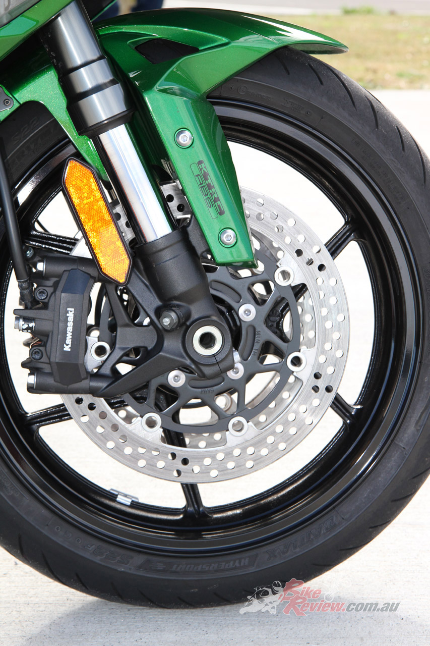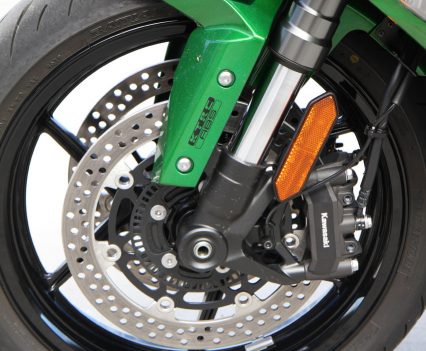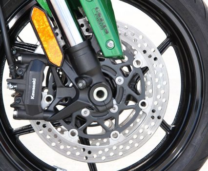 The KIBS (Kawasaki Intelligent Anti-lock Brake System), incorporating cornering ABS, work with the KCMF (Kawasaki Cornering Management Function) to optimise braking in all situations but particularly where it really counts, into turns. You can’t feel exactly what is going on but, no matter how tight or off camber, you can brake hard into a turn, deep into the apex, and the bike will still go where you want to go. it’s a well developed system.