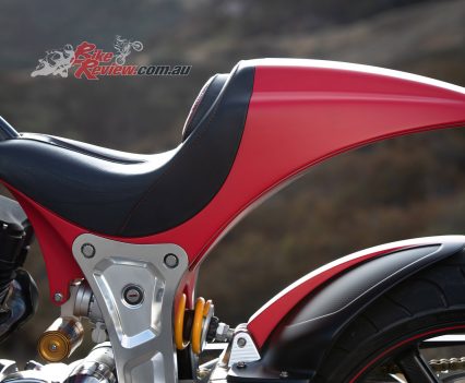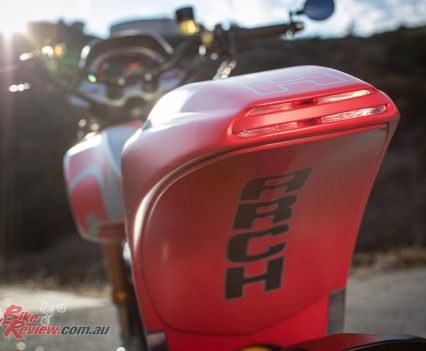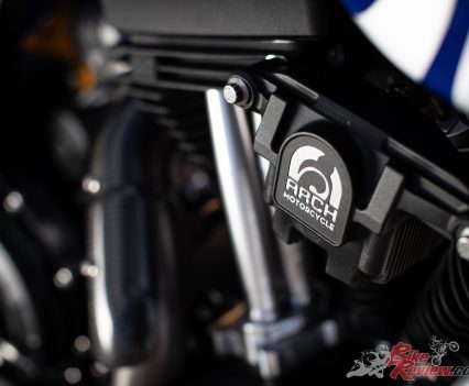 Now cruising on the freeway the ergonomics feel natural. I’m relatively short, yet the ‘bars and feet-forward controls aren’t a stretch. That firm suspension doesn’t jolt me out of the seat on bumps and undulations as I was expecting, in fact the ride quality is impressive. At 120-130km/h the motor is ticking over smoothly around 3000rpm, creating vibration through the ‘bars, which is noticeable rather than annoying. With its 19-litre fuel tank you could easily go touring on the new ARCH, no problem – the only detail lacking in this respect being a fuel range indicator.
