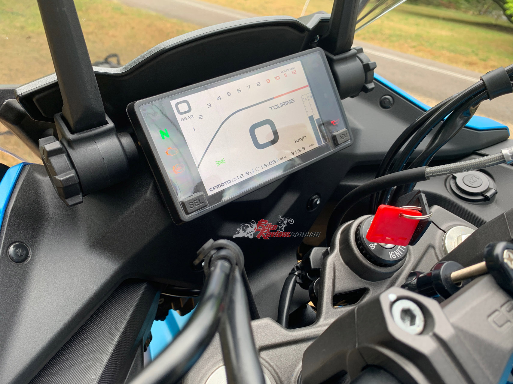 The CFMoto 650GT has a low seat, perfect for those under 175cm, while the screen is adjustable to ensure good weather and wind protection for touring. There is a USB charge point as well, plus a full size TFT dash and LED lighting.