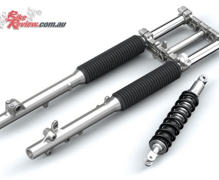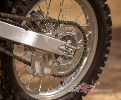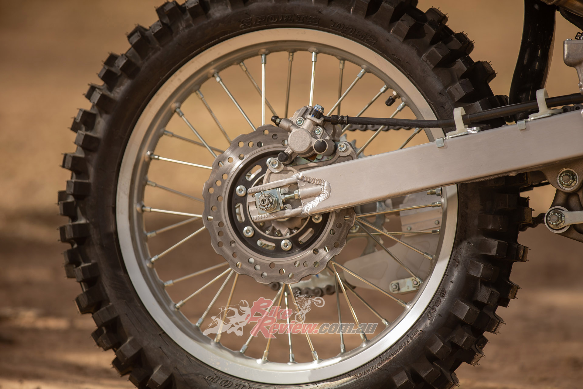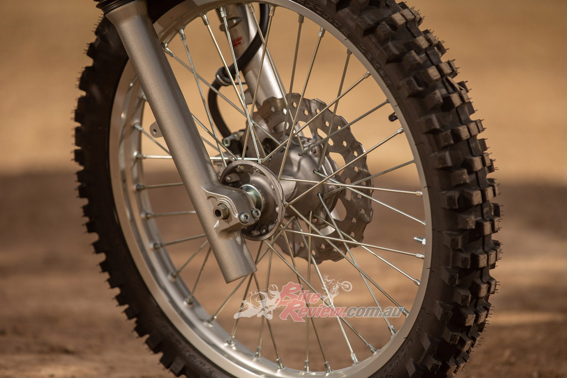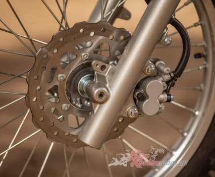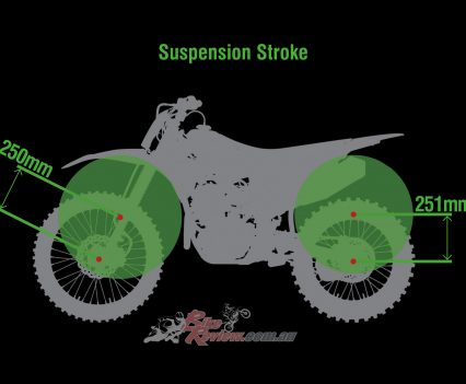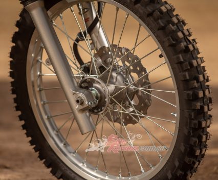 Large diameter aluminium wheels, 21-inch front and 18-inch rear, make riding trails easy and rolling over obstacles on any trail easy to overcome. That and the long travel suspension give great ground clearance of 300mm. The front suspension is a 250mm travel telescopic fork and the Uni-Trak rear shock gives 251mm of travel. Stopping the bike are front and rear petal disc brakes, which provide awesome stopping power.