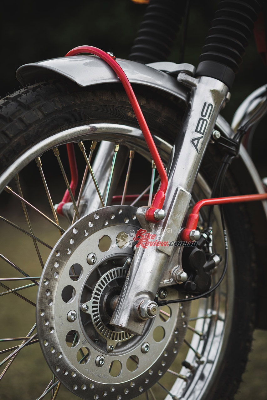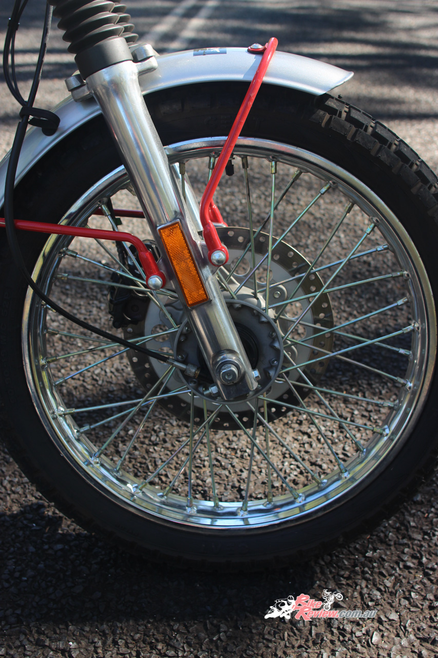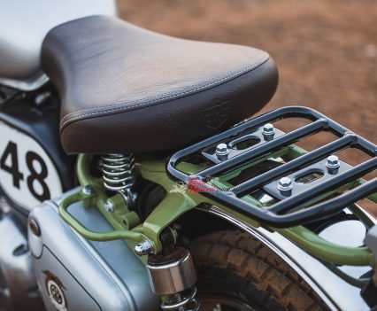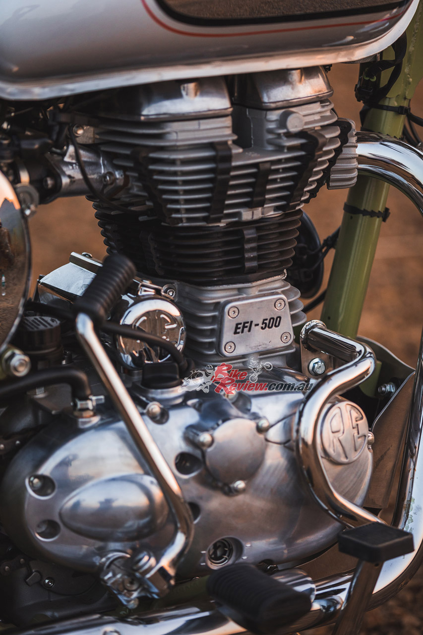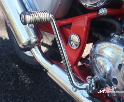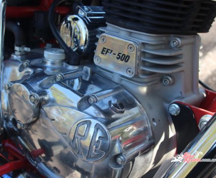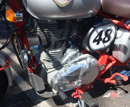 The motor used in Royal Enfield’s Bullet Trials 500 is a long standing motor, to be discontinued this year, used in many generations of the Bullet, now with EFI incorporated to bring it up to date. The all-aluminium, 499cc, single-cylinder, four-stoke, twin spark, air-cooled engine with a 84mm x 90mm bore x stroke produces 20.3kW at 5250rpm and 41.3Nm at 4000rpm. The Bullet features both electric and kick start. The Bullet Trials 500 Works Replica has a five-speed constant mesh transmission, with a wet, multi-plate clutch that is cable actuated.