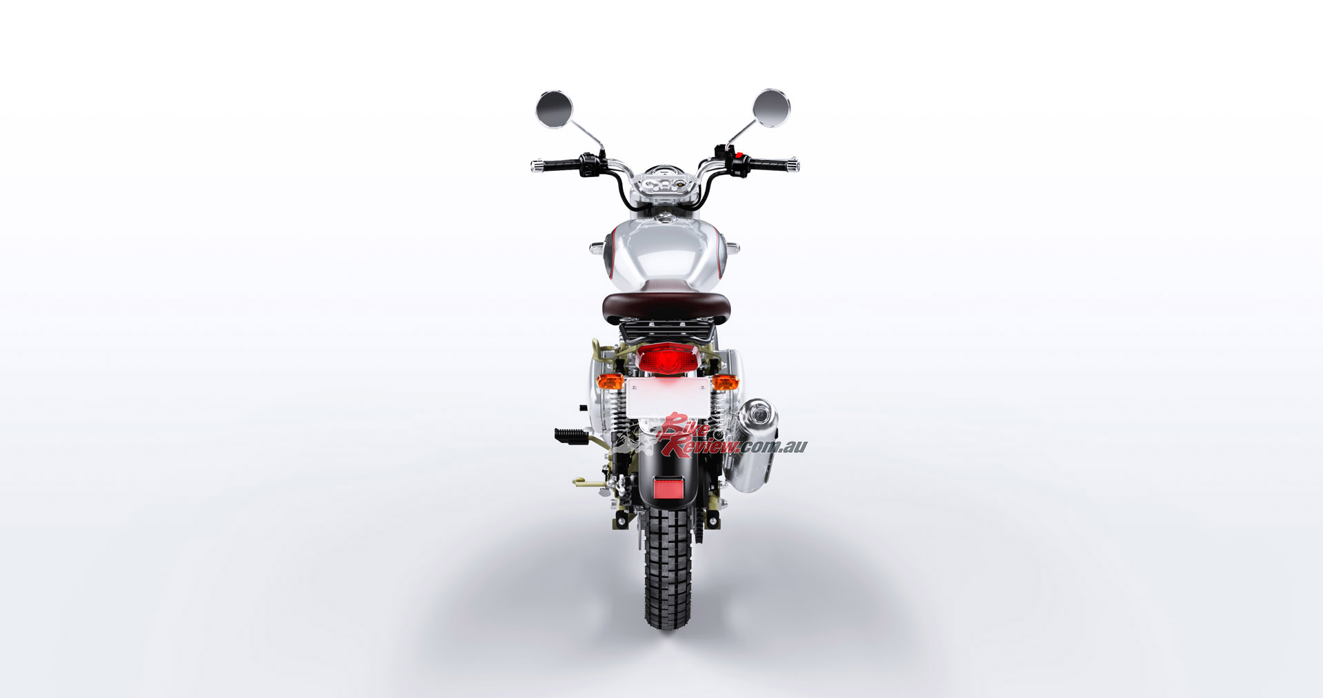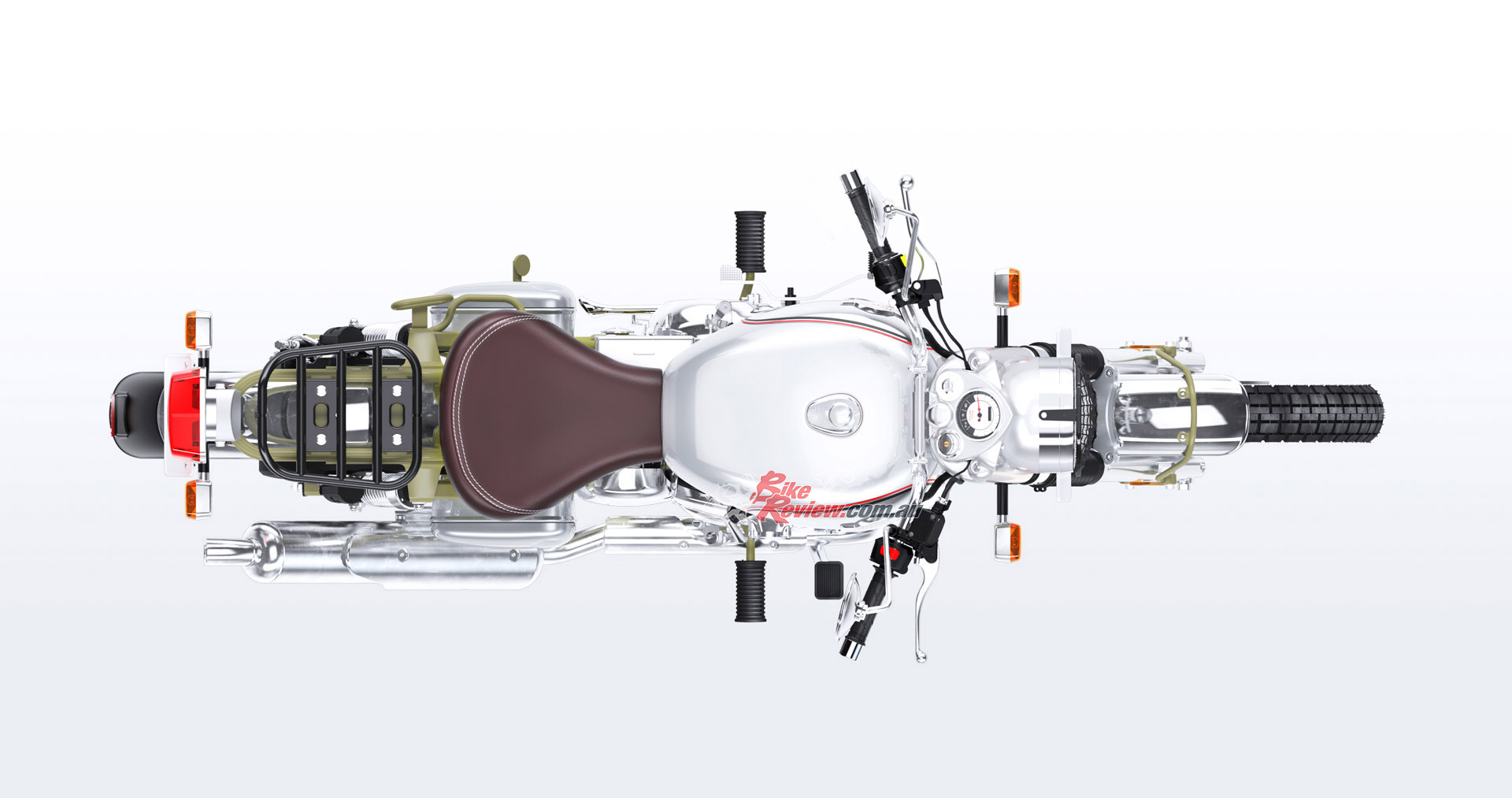 The Bullet has a total height of 1123mm and a length of 2080mm, a seat height of 800mm and ground clearance of 135mm. The Bullet weighs in at 192kg wet and has a fuel capacity of 13.5L. Halogen lighting is featured in the simple, round headlamp, indicators, and tail/brake light.