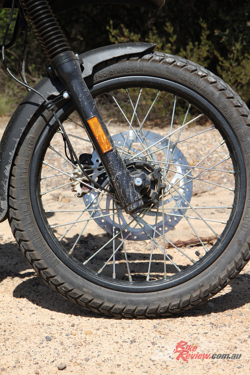Wheels & Tyres: Steel rims, 36 spoke wheels, Pirelli MT-60 tyres, 90/90 – 21in, 120/90 – 17in