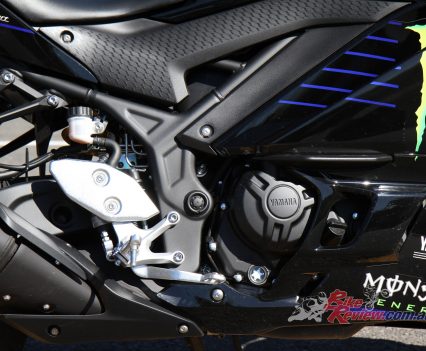 The YZF-R3’s motor is one of the standout features of this machine. The parallel twin, 321cc unit churns out 30.9kW (41.4hp) and puts 29.6Nm of torque to the ground. With the R3 weighing in at only 167kg wet, this makes for a fun and surprisingly quick learner machine. Revving all the way up to 13 grand and with gearing on the taller side, the mid range and top-end power of the YZF-R3 is astonishing and overall is really at the top of it’s game in the small displacement sportsbike category.