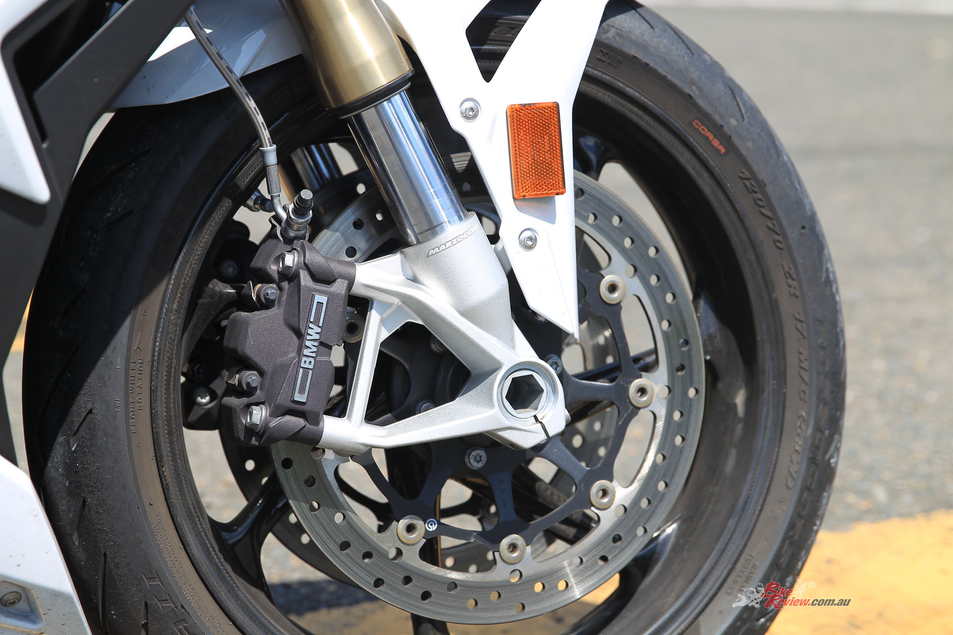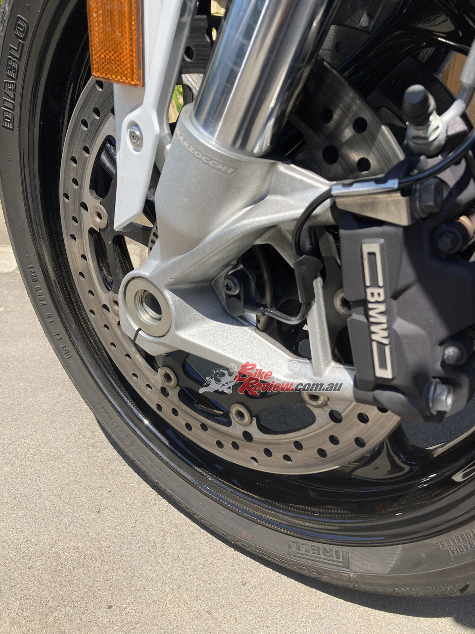 Brakes: BMW Motorrad ABS Pro, dual 320mm rotors, radial four-piston Hayes calipers, single rear 220mm rotor, single-piston floating Brembo caliper, conventional master-cylinder.