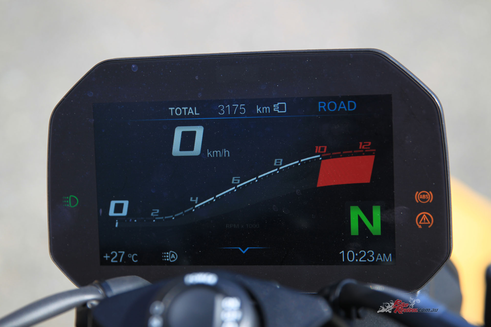 The rider can choose between customised screen displays for various purposes. The Pure Ride Screen, for example, provides all necessary information for normal road riding, while a further Core Screen shows displays for banking angle, deceleration and traction control.