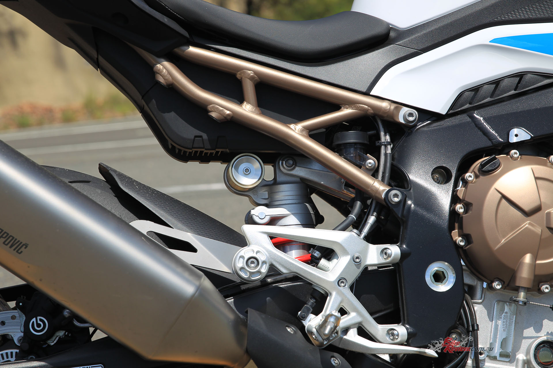 The underslung swingarm has been adopted from the S 1000 RR, while the spring strut with Full Floater Pro kinematics is now located significantly further away from the swing axis and engine. This prevents the shock from heating up due to waste heat and ensures even more stable temperature behaviour and more constant damping response. In combination with the swingarm, which has its roots in motorsports, this results in more tyre grip and lower tyre wear, BMW claim.